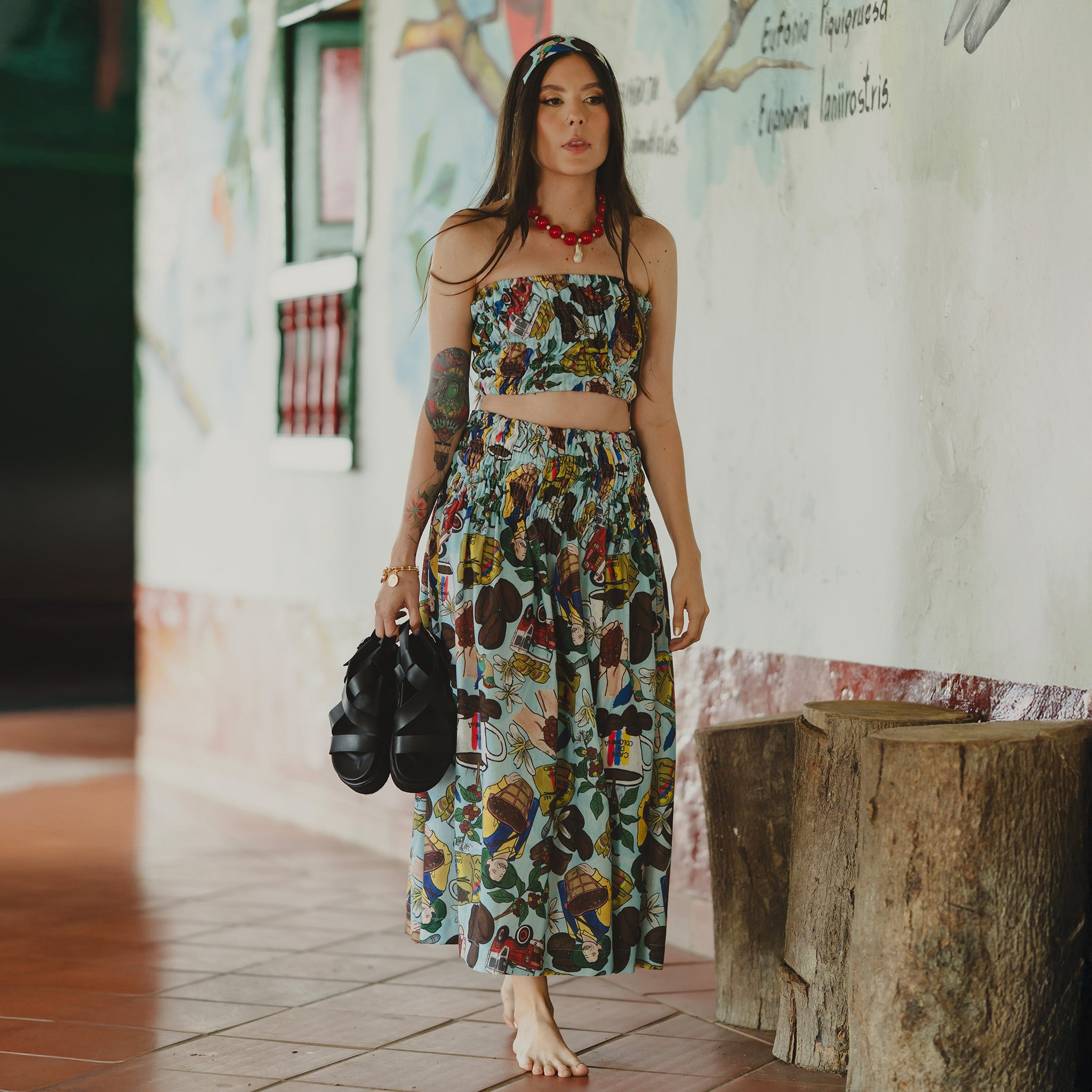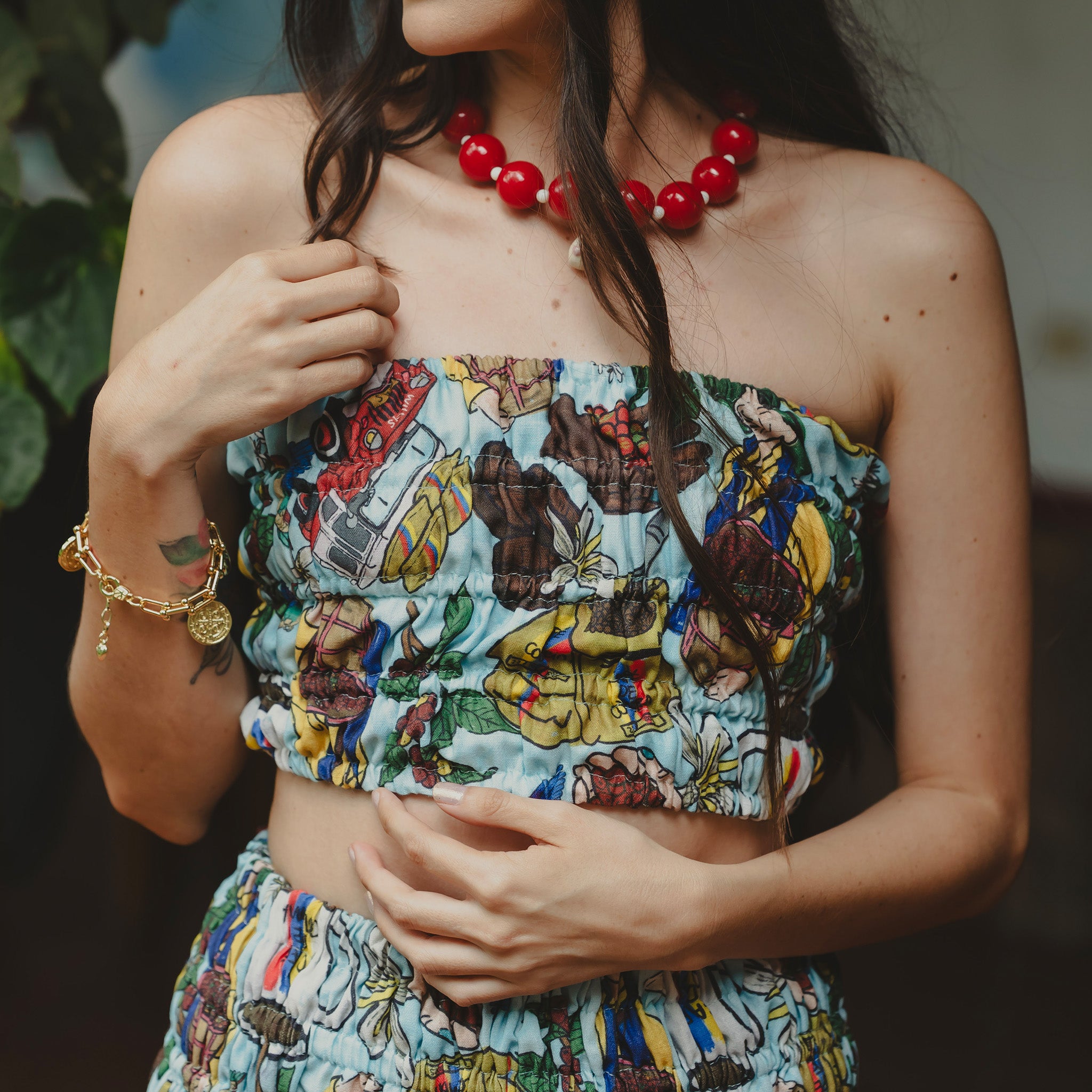 El estampado ilustrado revive escenas de la cultura cafetera: chivas, granos, flores, canastos y personajes que rinden homenaje al campo colombiano. Un tesoro lleno de color y tradición.