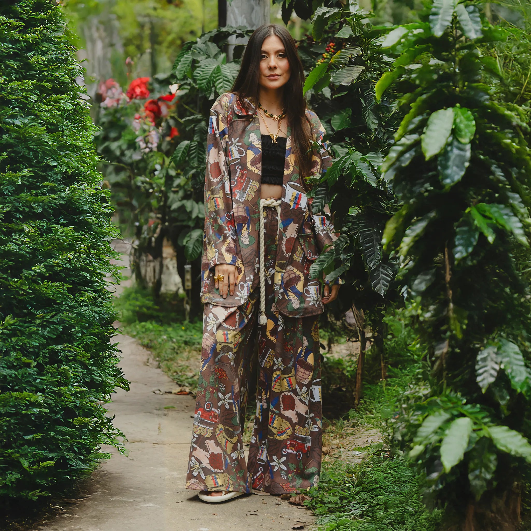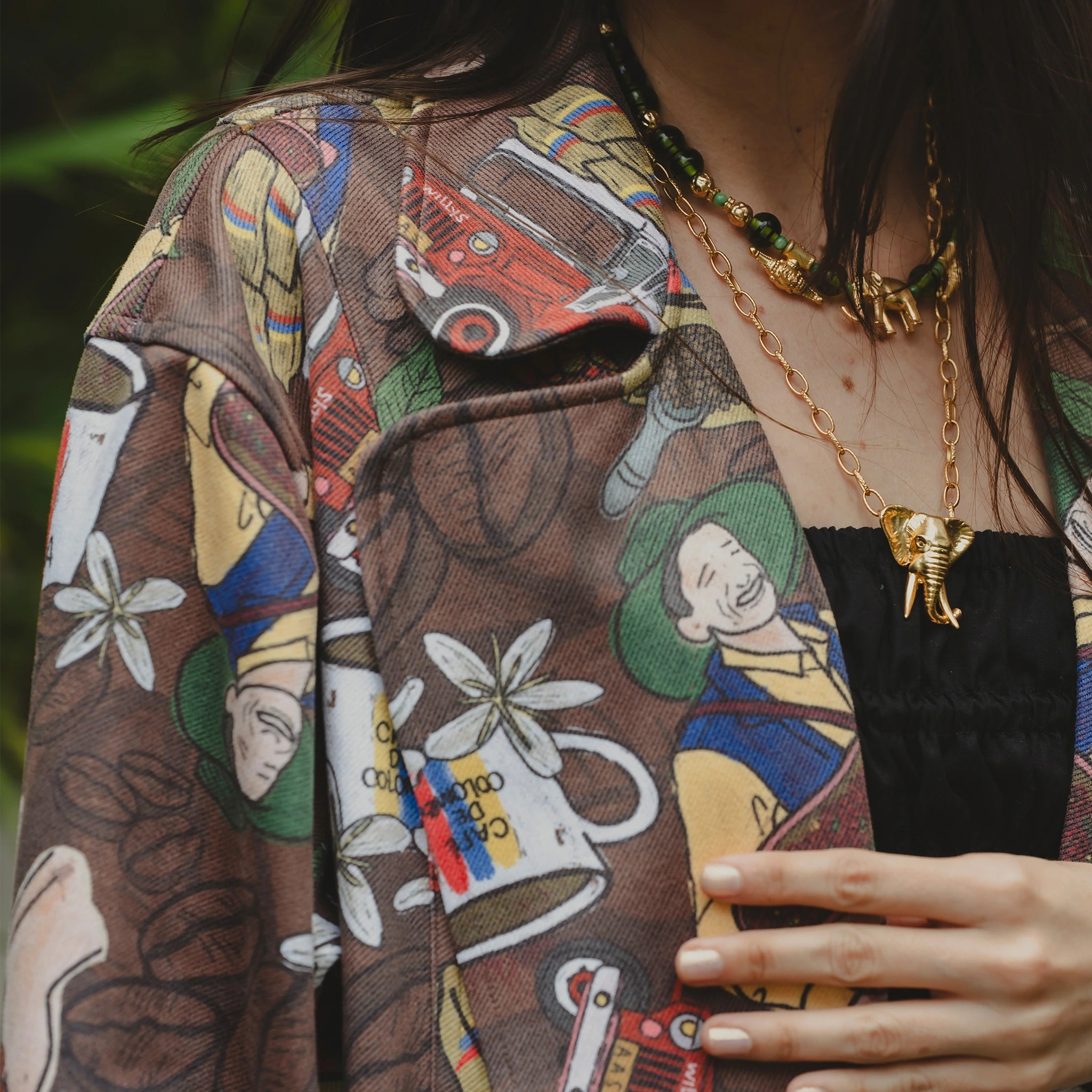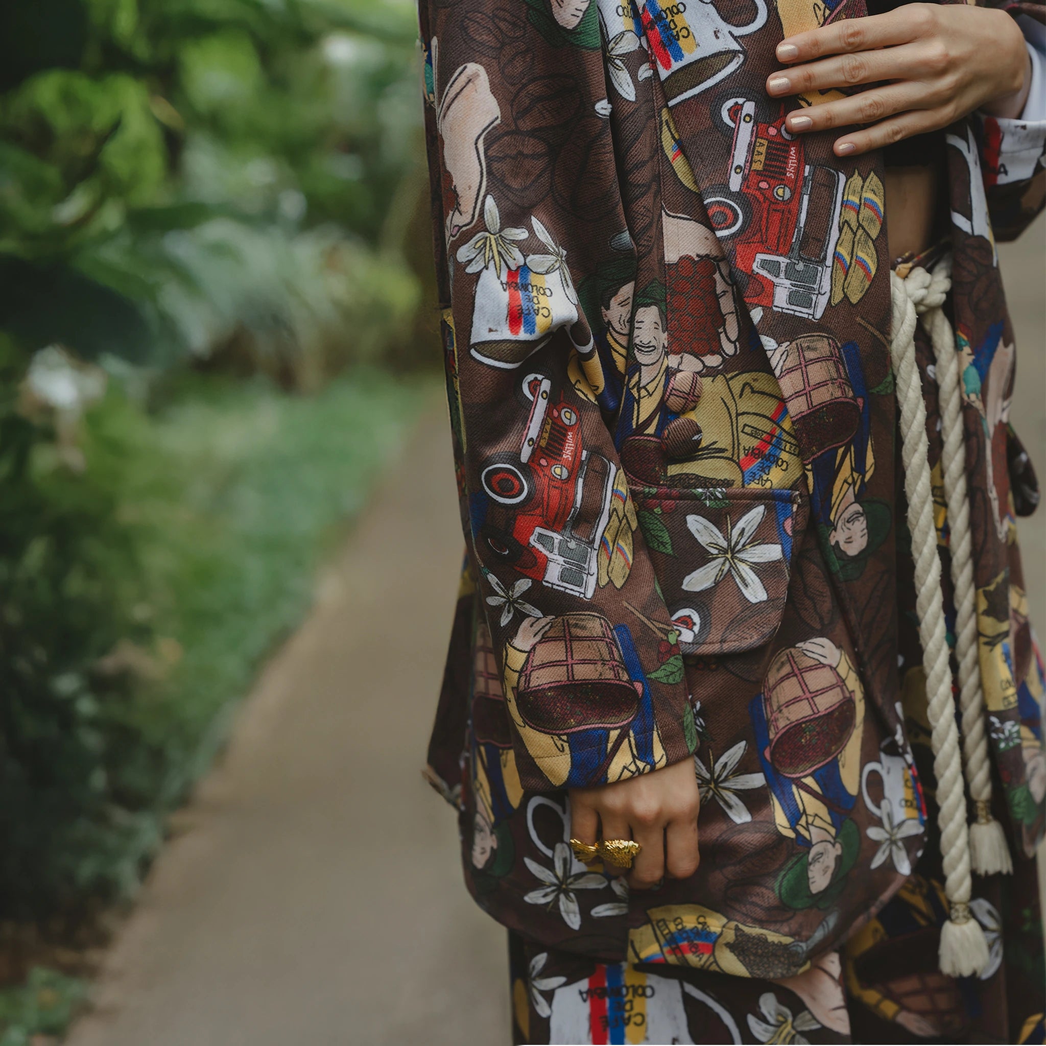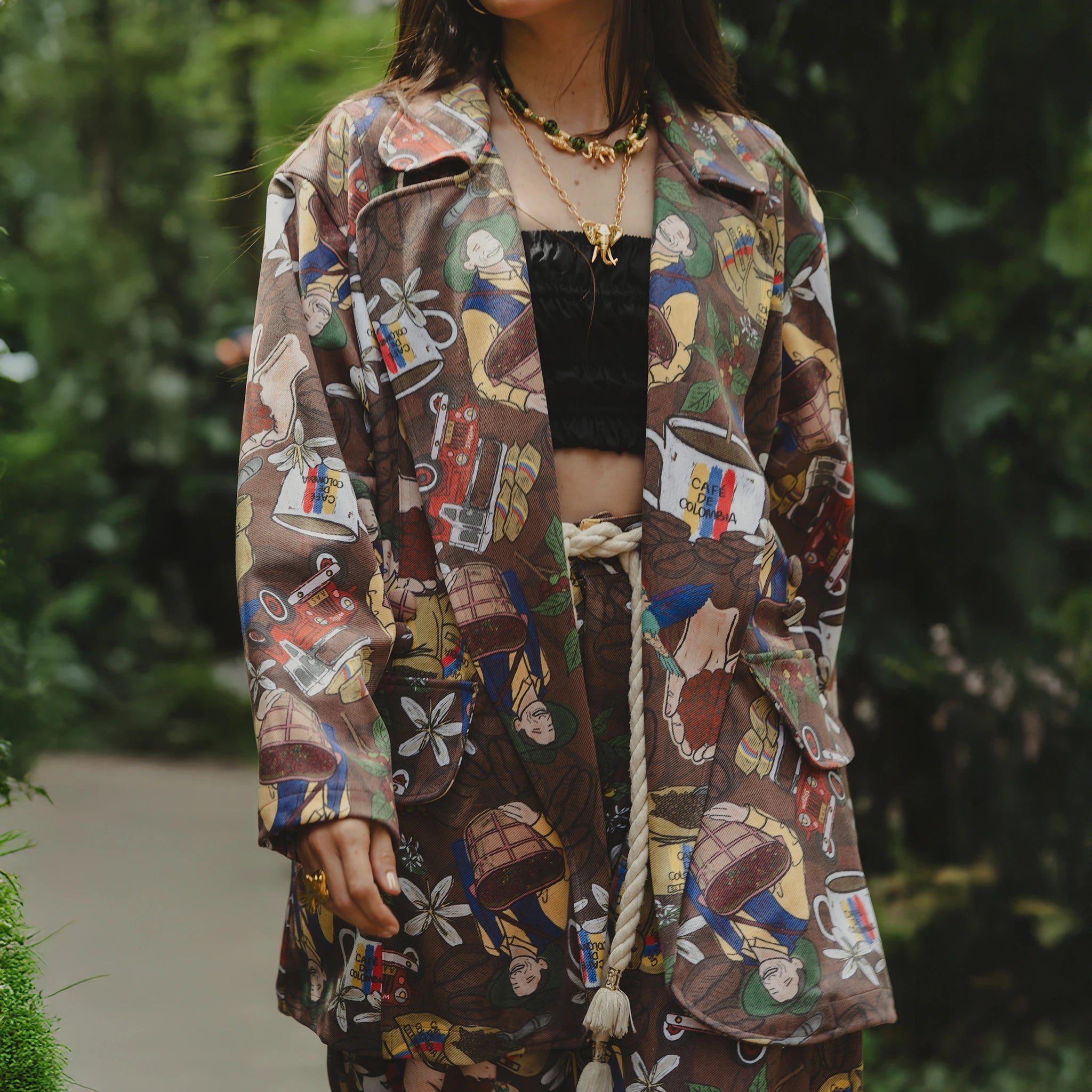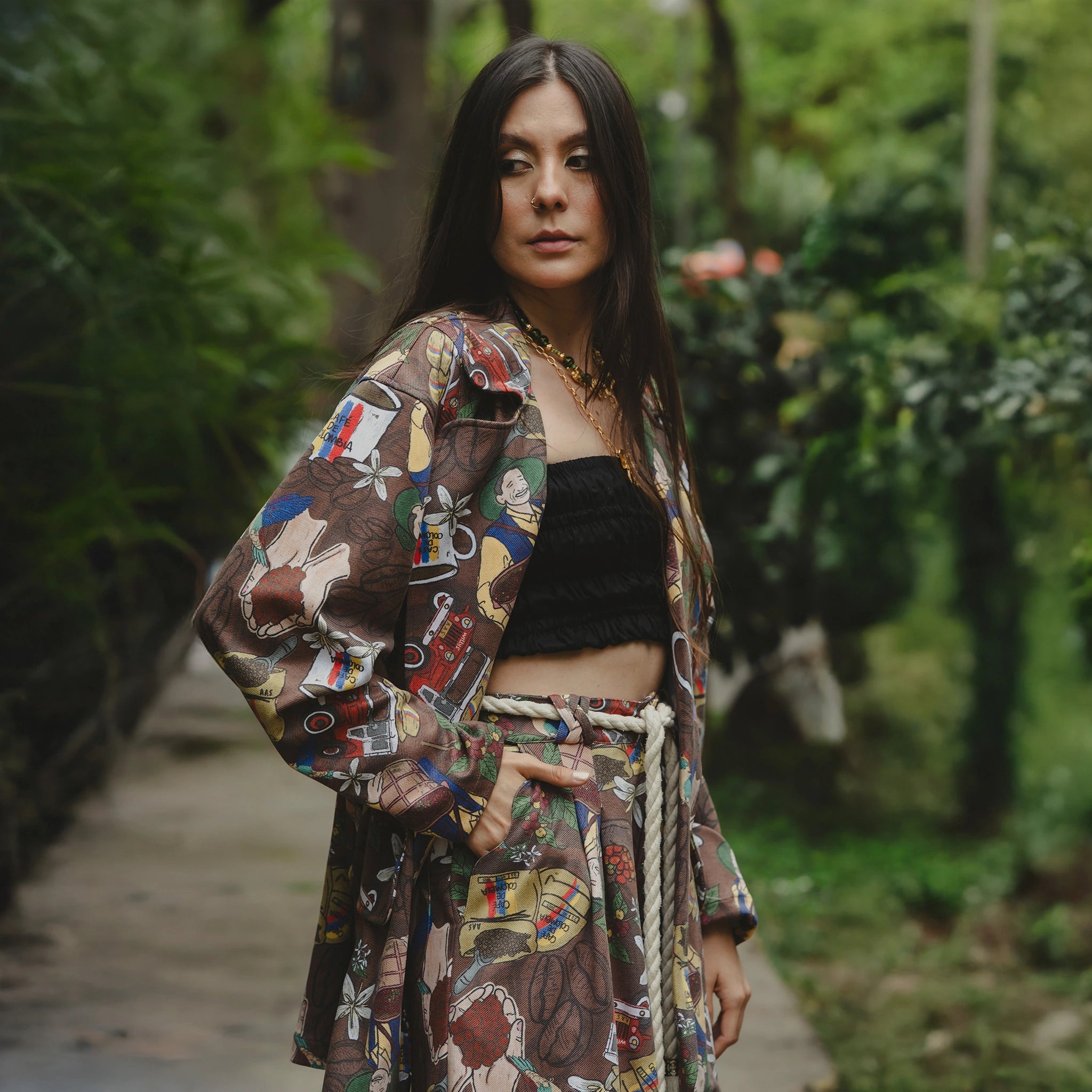 Su silueta oversize y caída fluida se adaptan con elegancia desde una talla XS hasta una XL. El estampado narra la riqueza visual y cultural del café colombiano ☕🌸🇨🇴.
