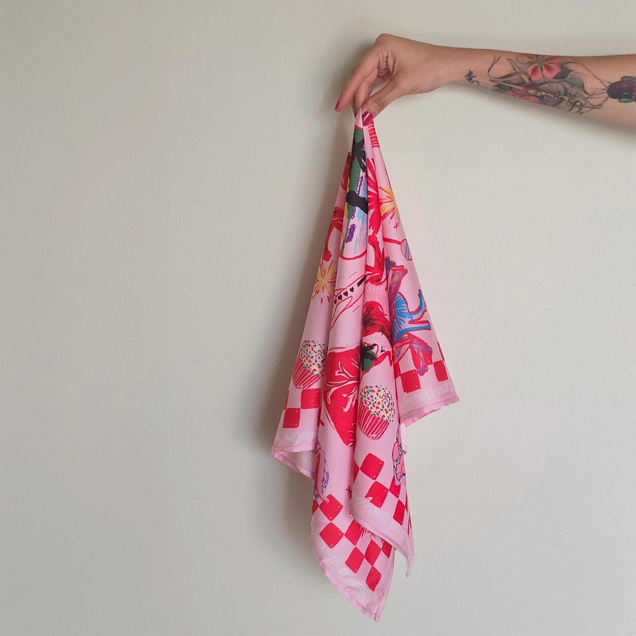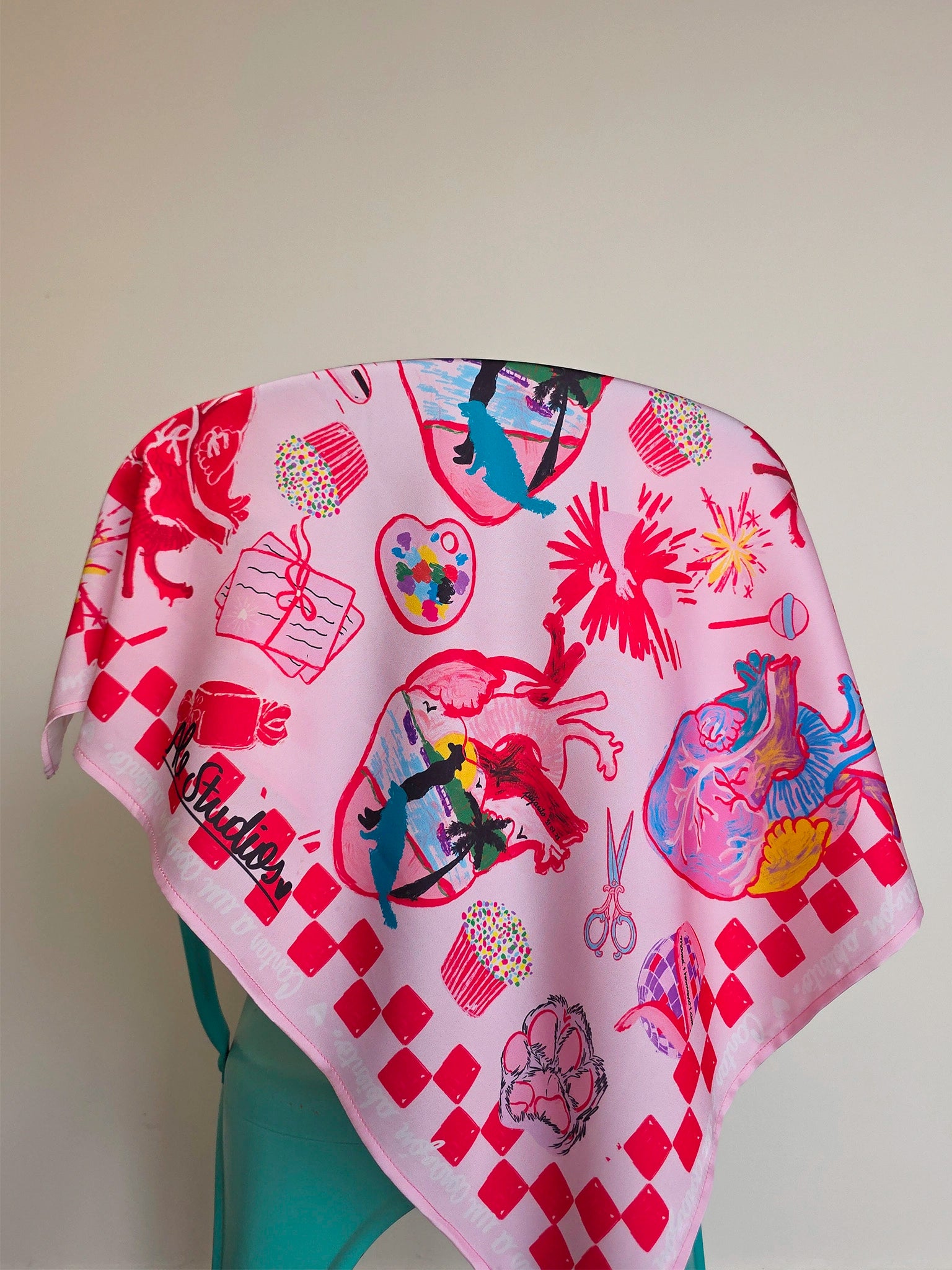 Pañoleta de seda de 70x70 cm con un estampado que celebra la felicidad en sus formas más simples. 💫