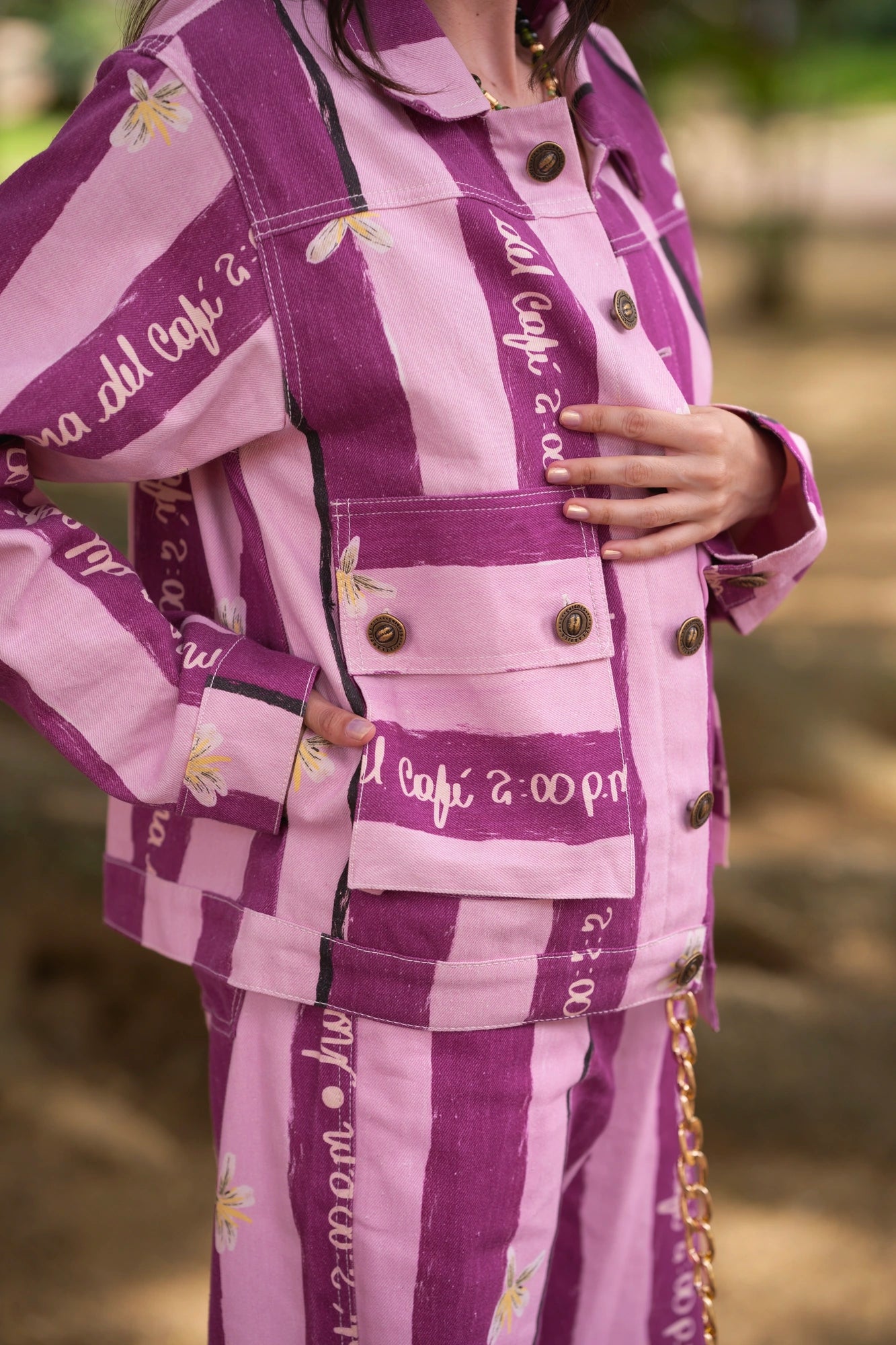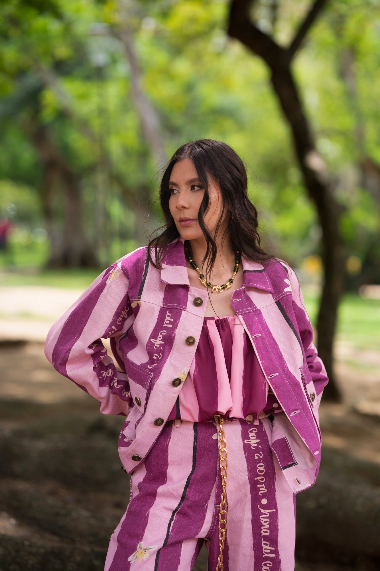 Su estampado en líneas rosadas, moradas y beige celebra la dulzura y vitalidad de la floración, mientras que los detalles de la flor del café evocan el origen de cada grano. Los bolsillos camuflados en la parte delantera aportan practicidad sin romper la armonía del diseño, y los botones en forma de café sellan la inspiración con un guiño único.