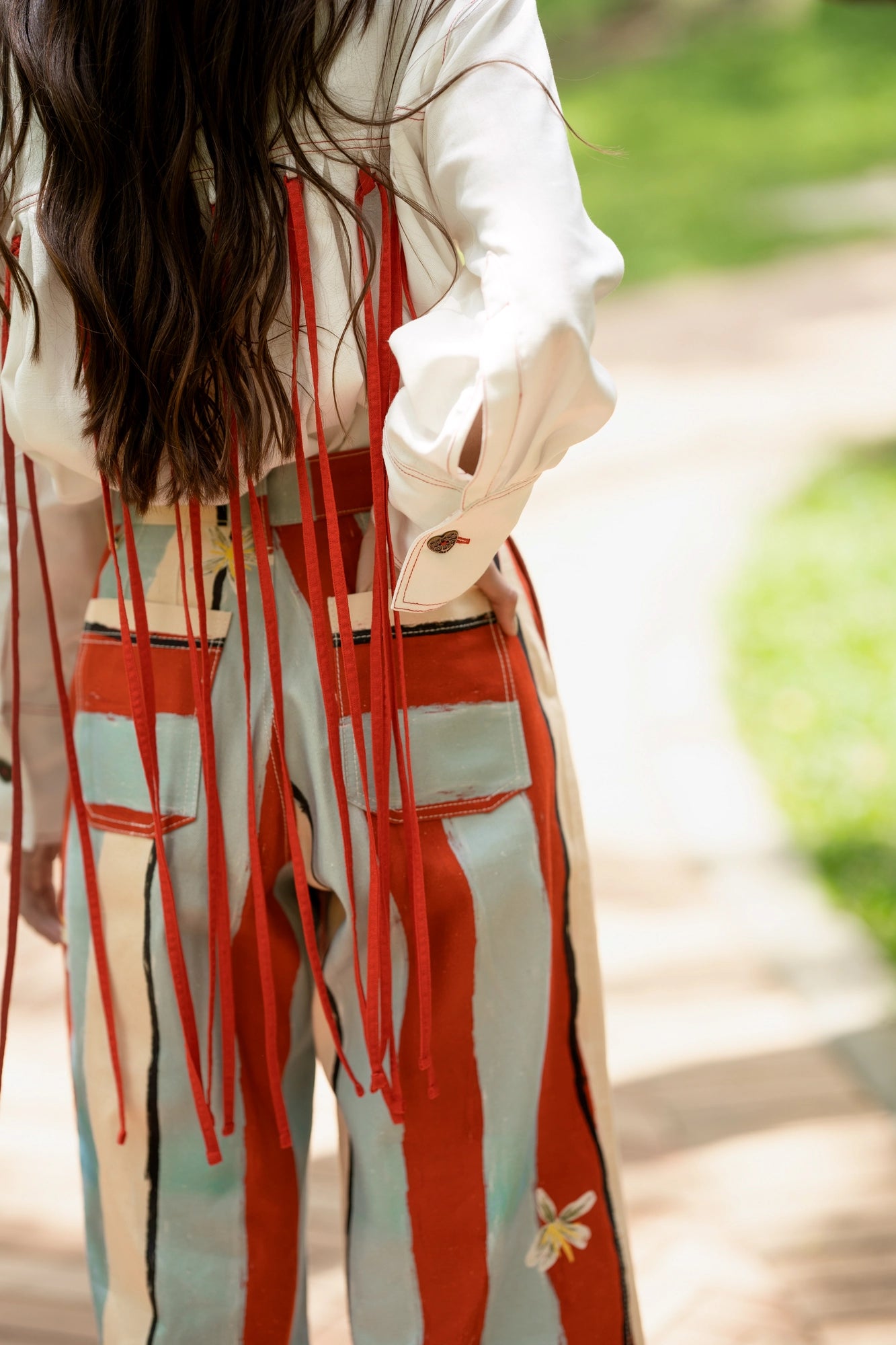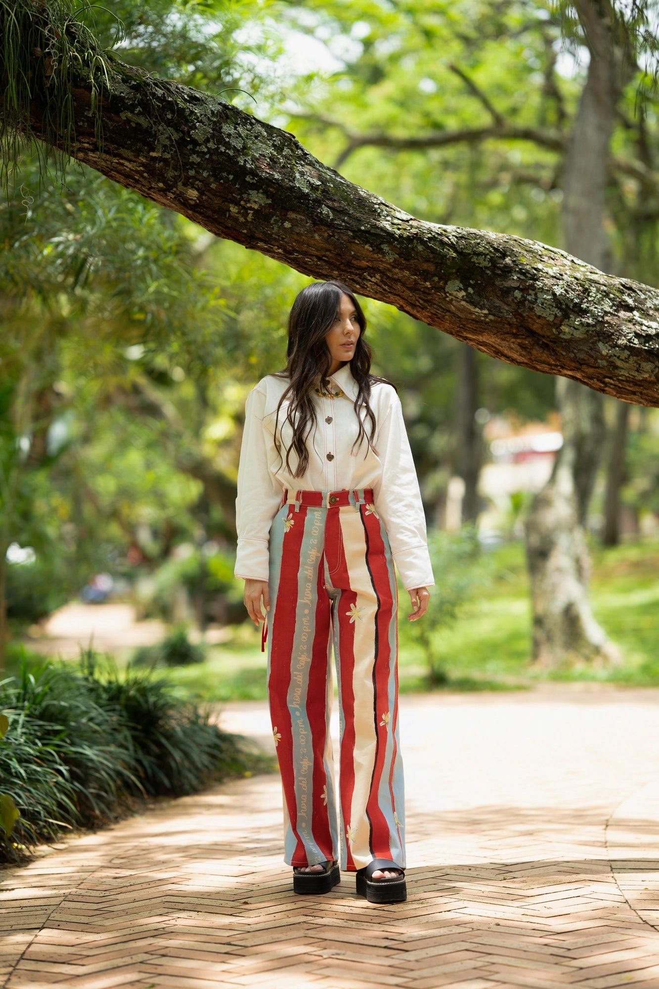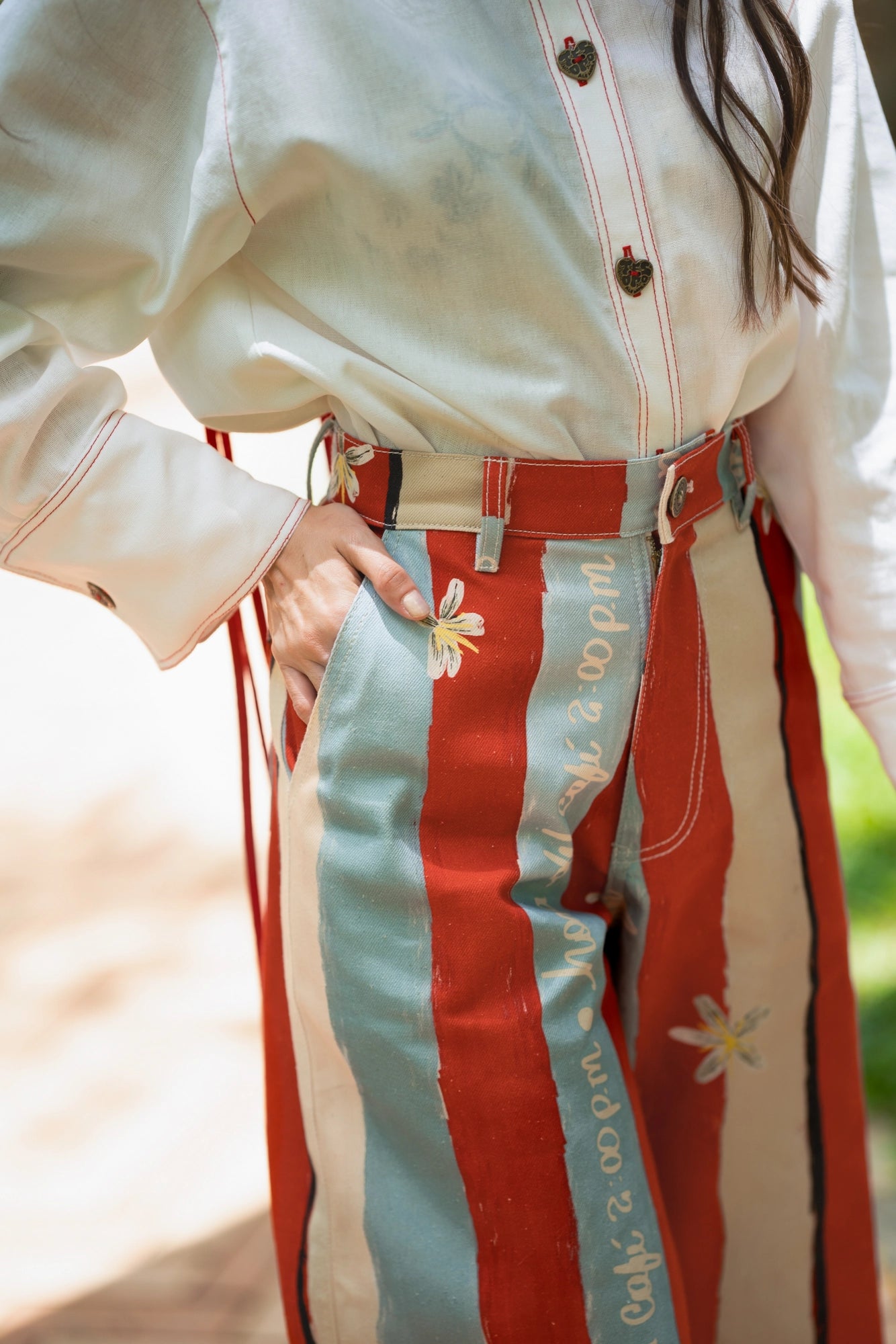 El Pant Denim Ritual 2:00 PM celebra el ritual cafetero de la tarde con un diseño lleno de color e identidad. Confeccionado en denim 100% algodón, su silueta amplia y de talle alto se viste con líneas en tonos celeste, rojo y beige, acompañadas de la flor del café y la frase bordada “2:00 pm hora del café”.