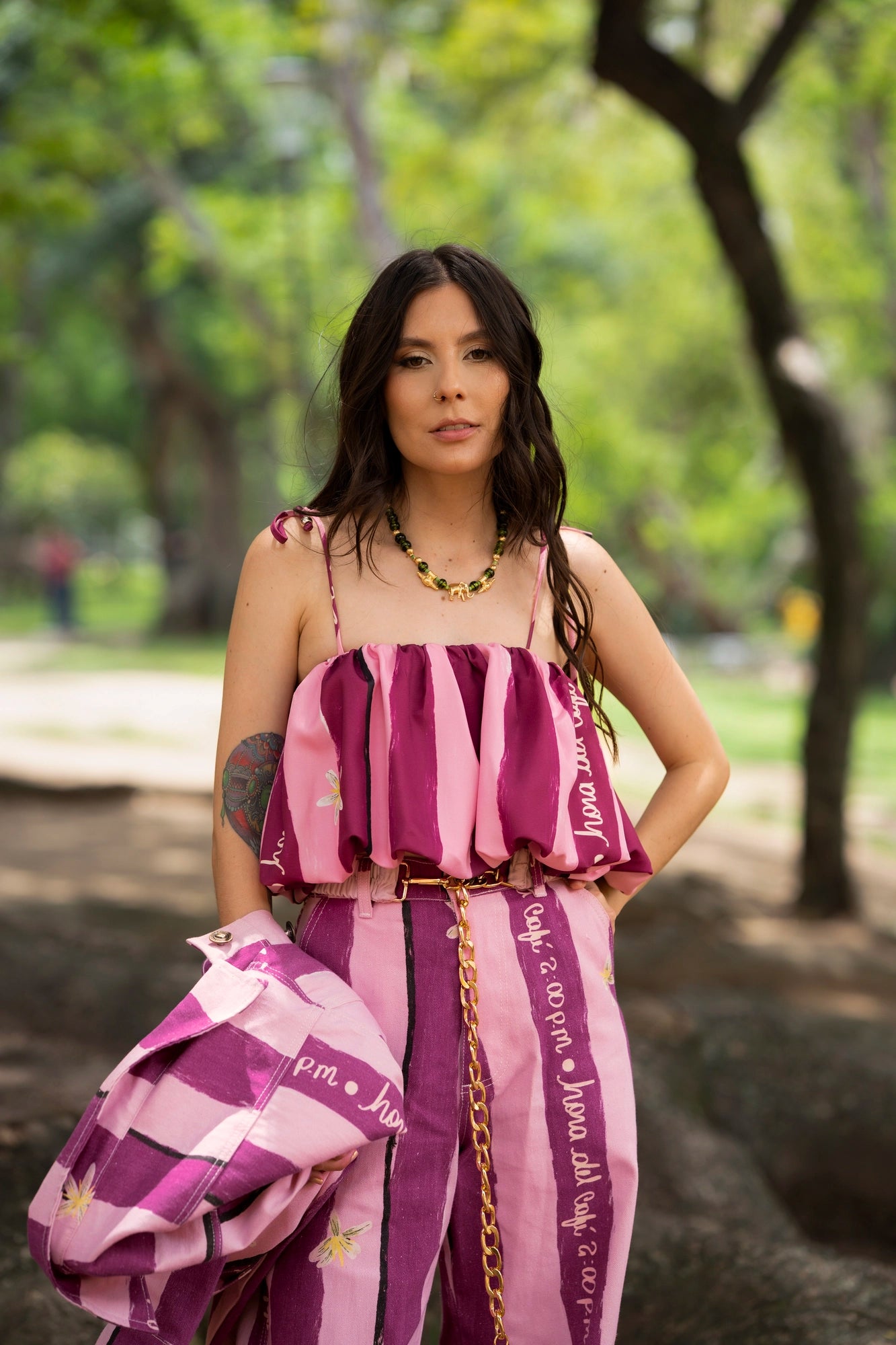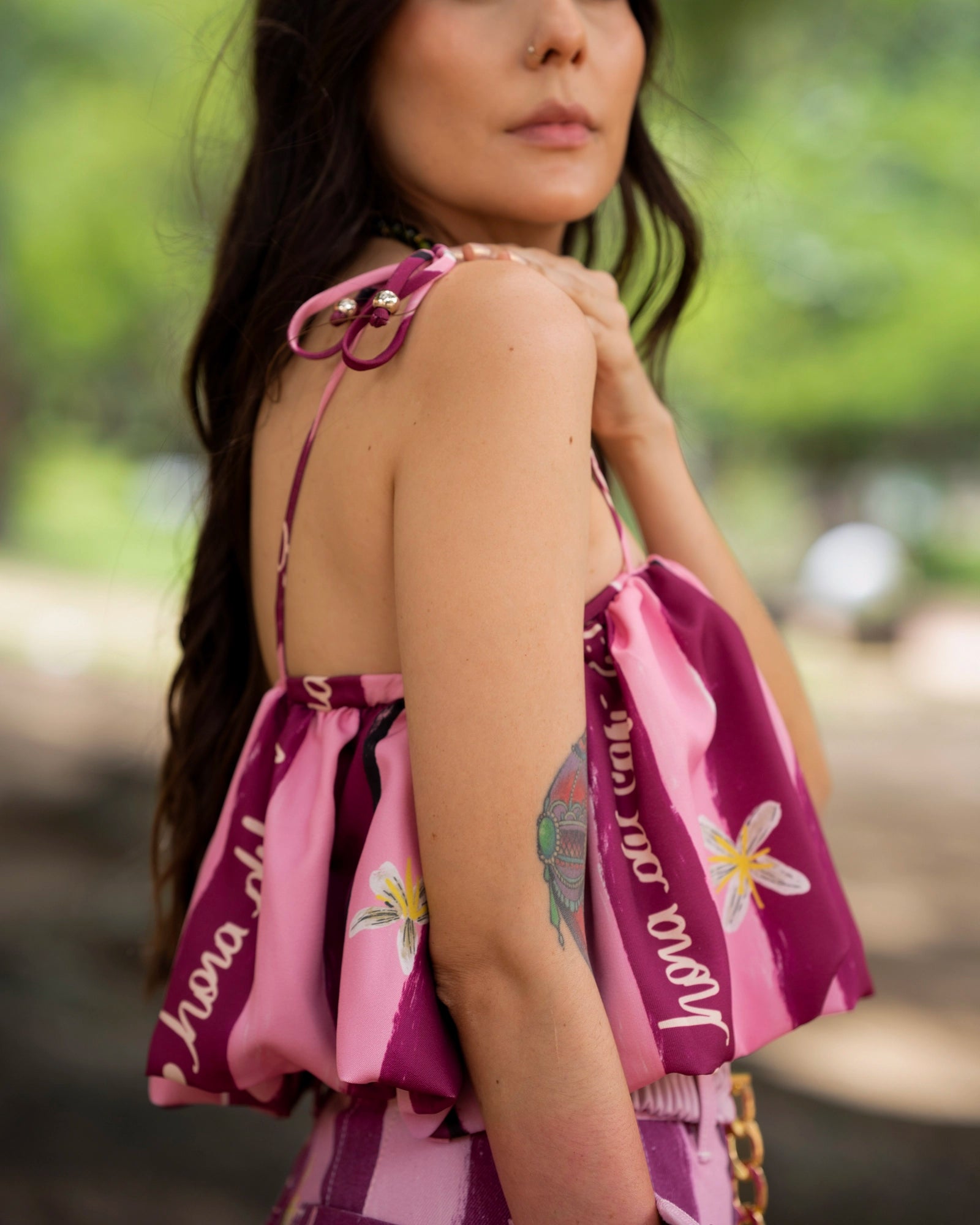 El Top Sabor a Flor 🌺☕ celebra la delicadeza y fuerza del café en su máximo esplendor. Confeccionado en poliéster ligero, su silueta tipo globo inspirada en la apertura de una flor, se realza con un estampado de líneas rosadas, moradas y beige, acompañado de la flor del cafeto como símbolo de vida y dulzura.