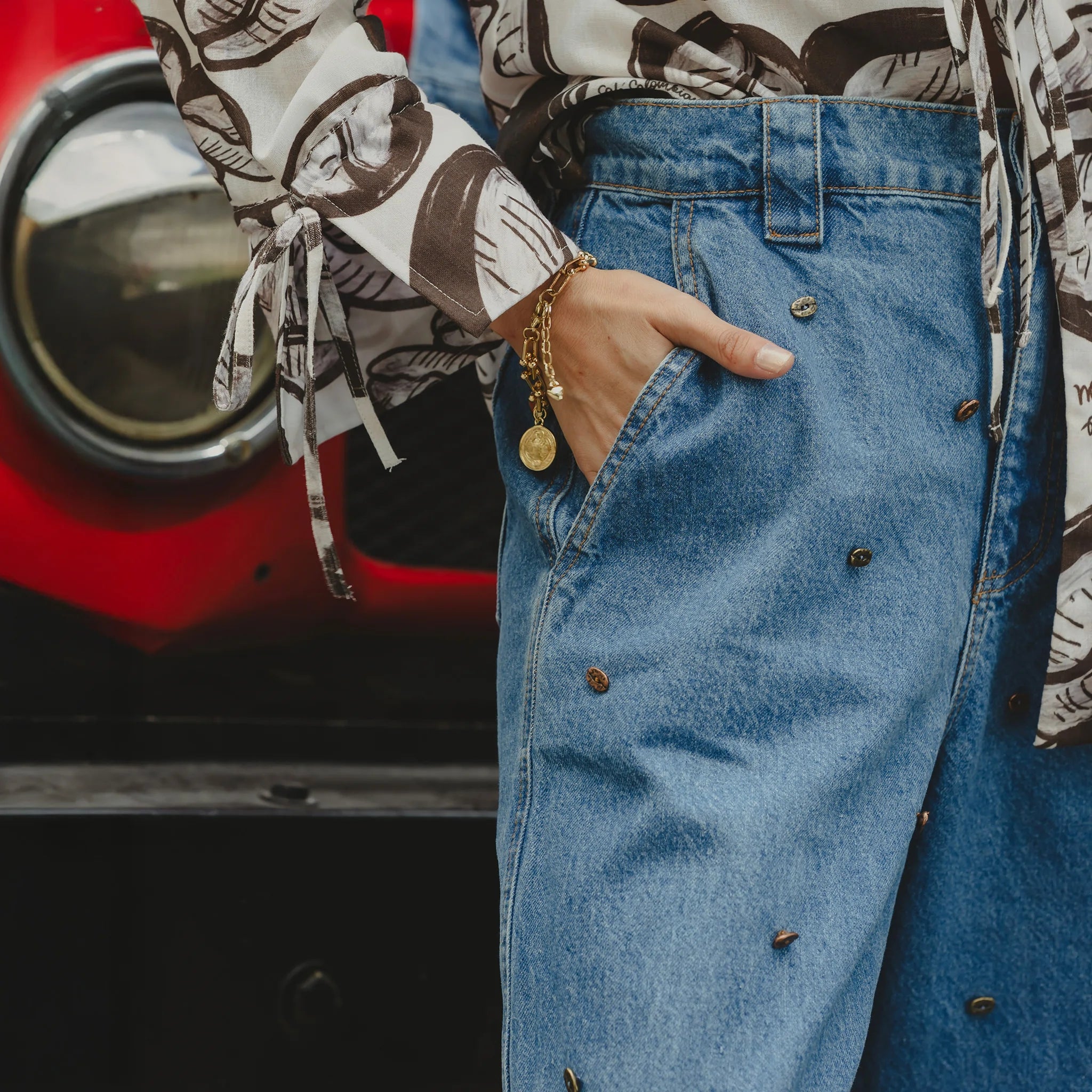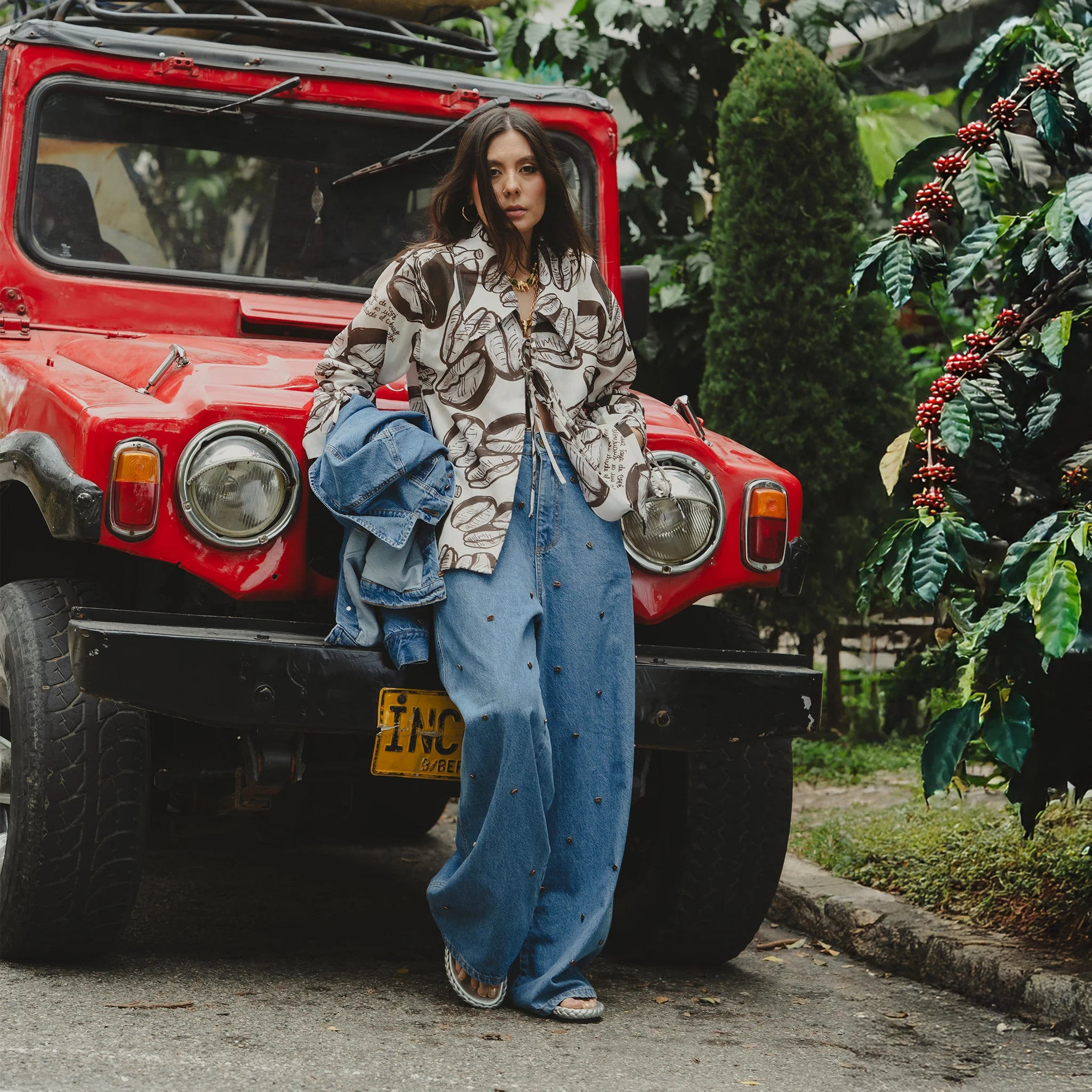 Los botones metálicos en forma de grano de café tostado sellan su inspiración con un guiño sutil pero poderoso. Ideal para llevar como set con la chaqueta o combinarlo con piezas más suaves para contrastar texturas.
