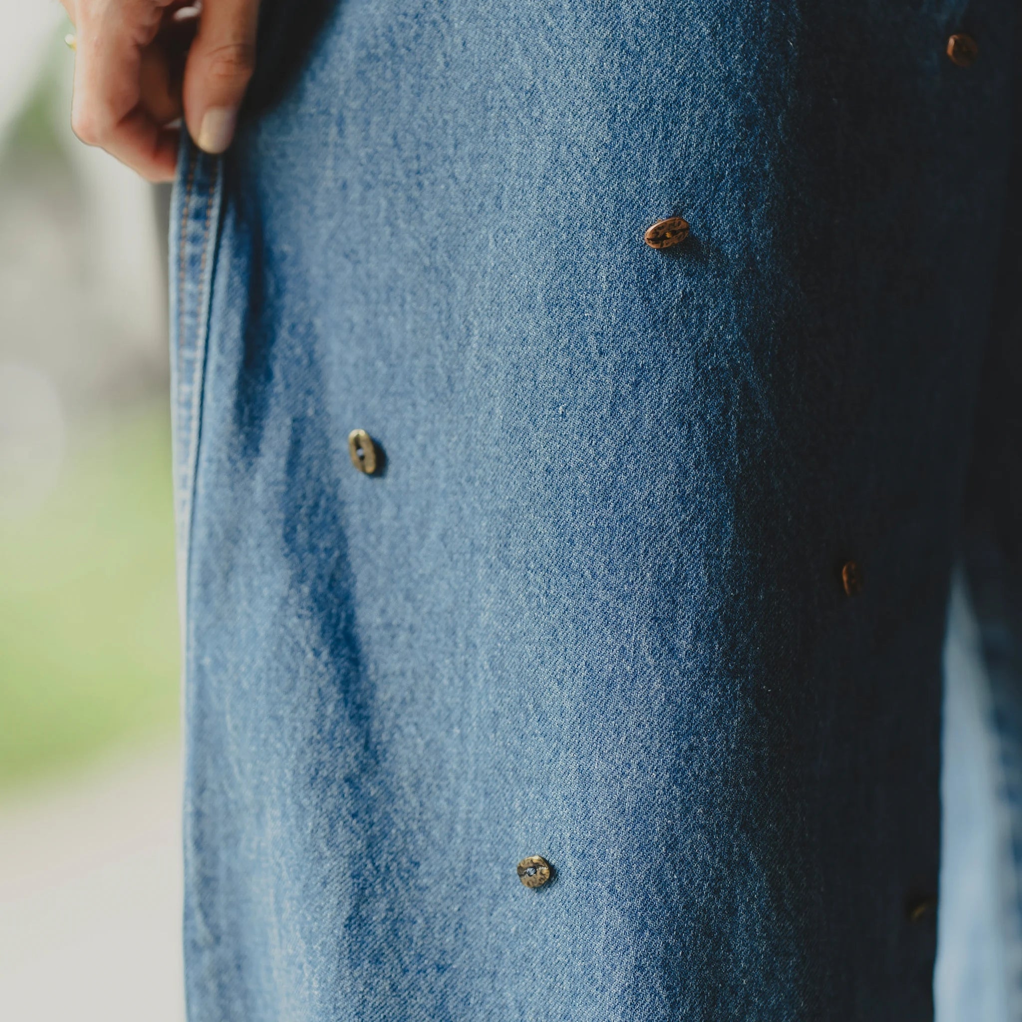 Este tesoro está confeccionado en denim 100% algodón de 10 oz 🌾, una fibra natural, resistente y con carácter. Su textura firme abraza el cuerpo con estructura y elegancia, mientras que el índigo profundo evoluciona con el tiempo, contando tu historia en cada uso 💙. Es un material noble que respira, acompaña y mejora con los años —como el buen café ☕️. Perfecto para quienes aman prendas duraderas, versátiles y con propósito.