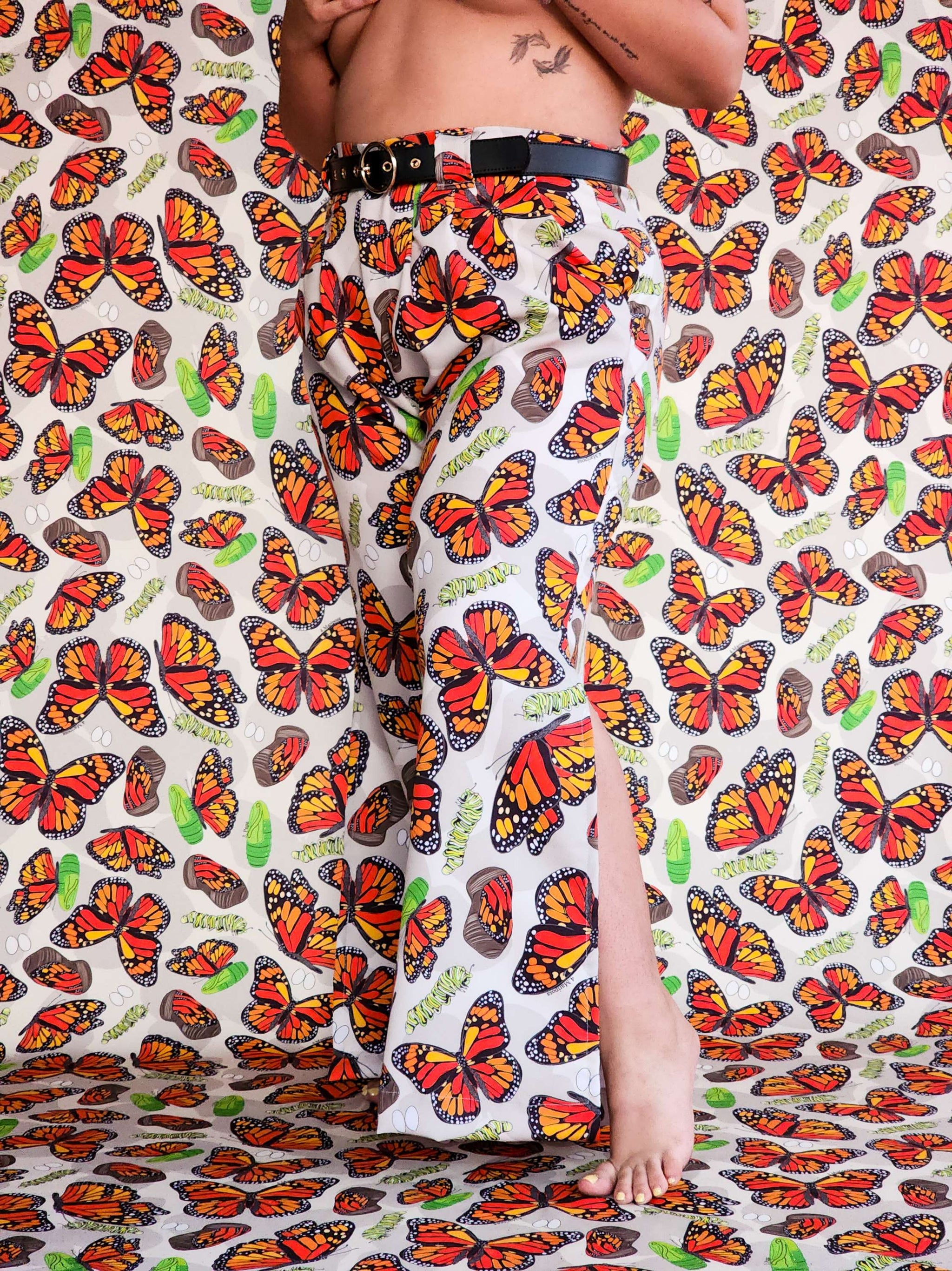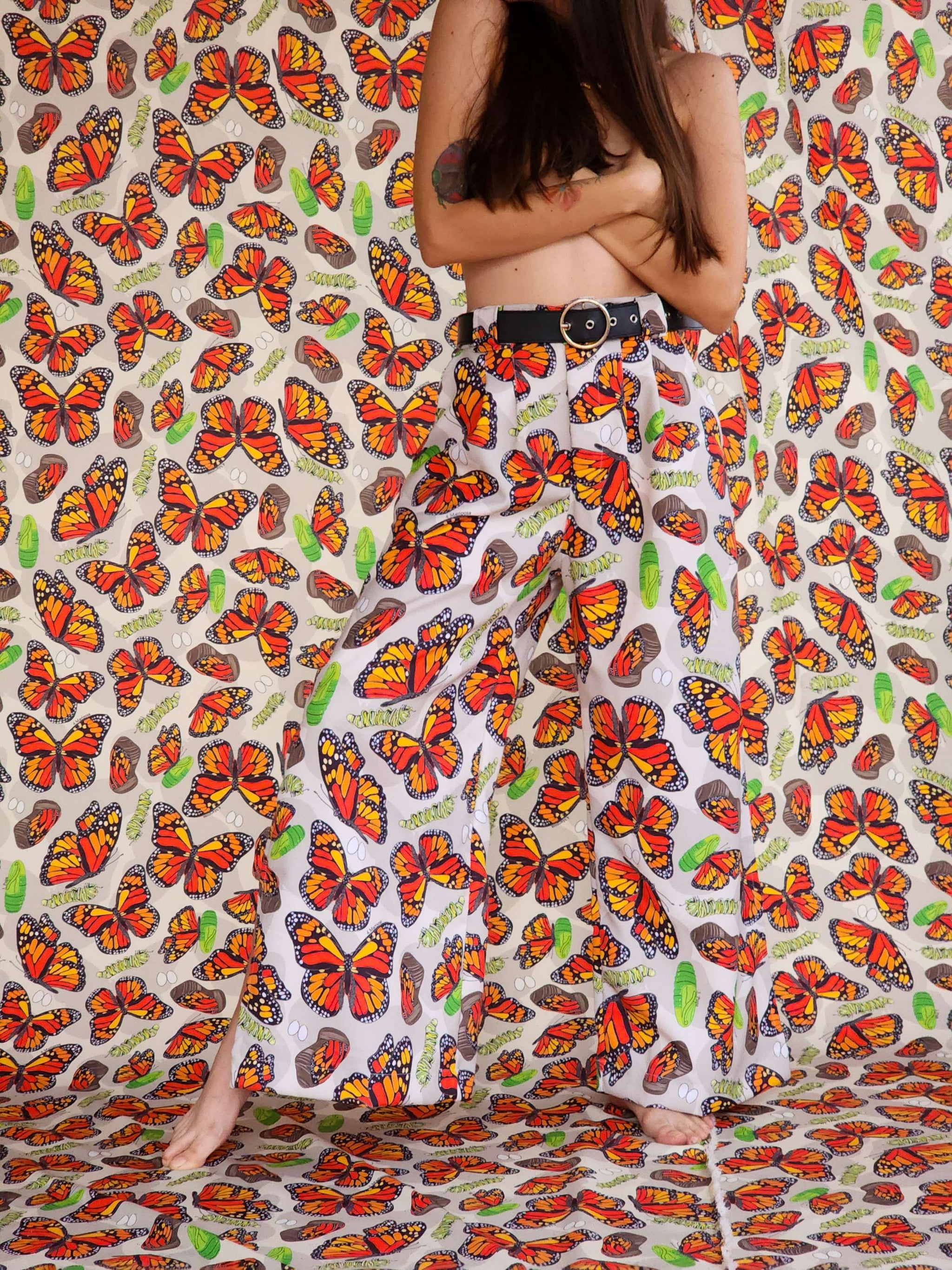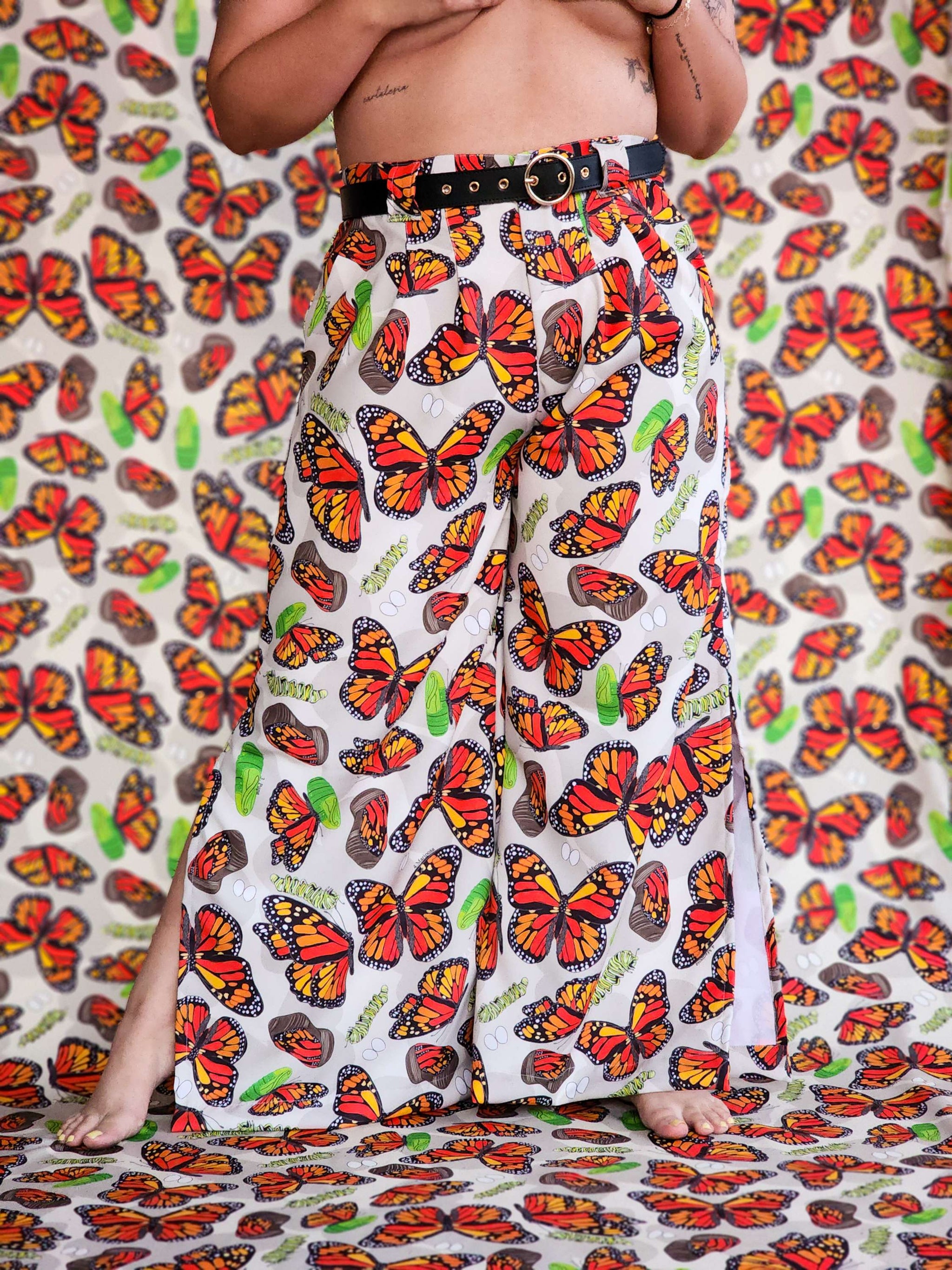Pantalón tiro alto (a la cintura), de silueta amplia, caída suelta, bolsillos a los dos laterales, bota recta (ancha) y abertura lateral.