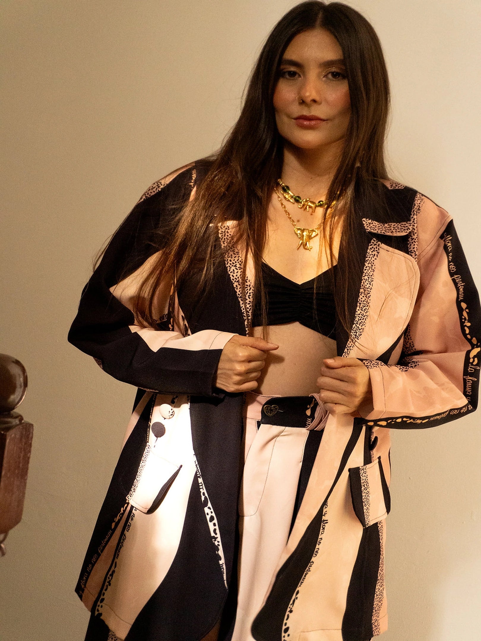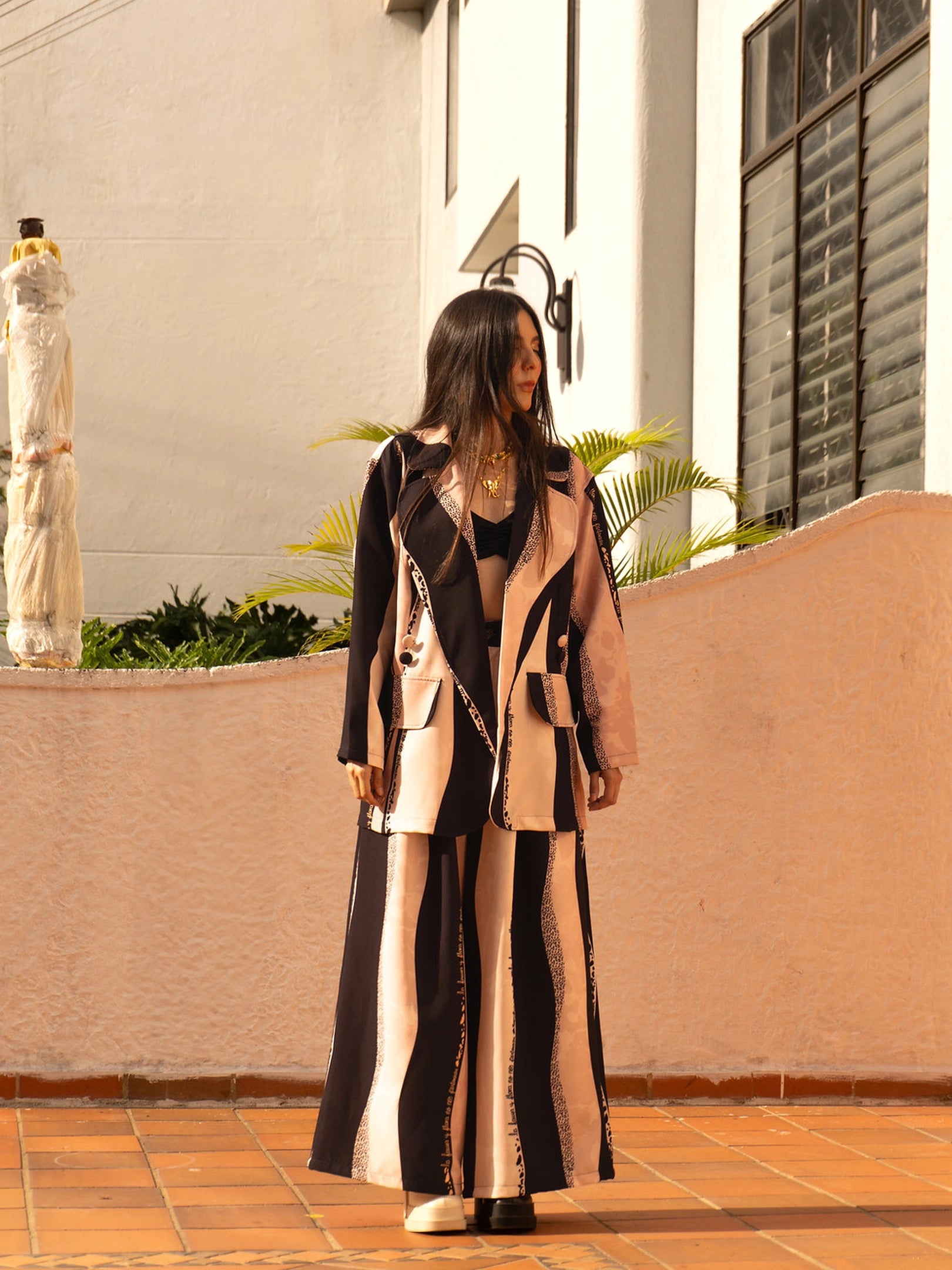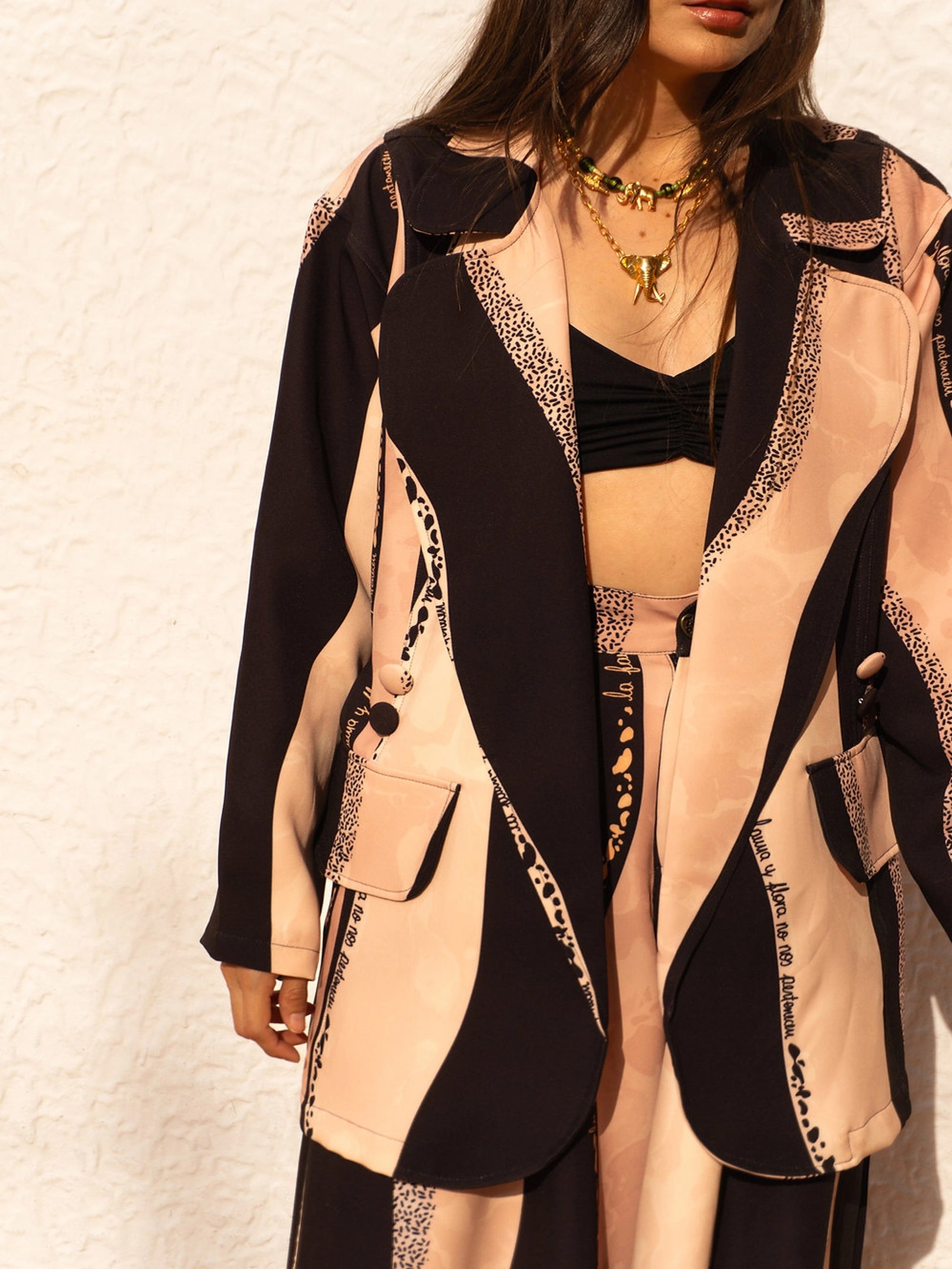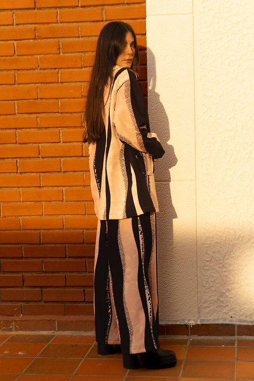 • Estampado exclusivo con líneas ondulantes en tonos negros y beige 🌈 haciendo alusión al Día y la Noche.