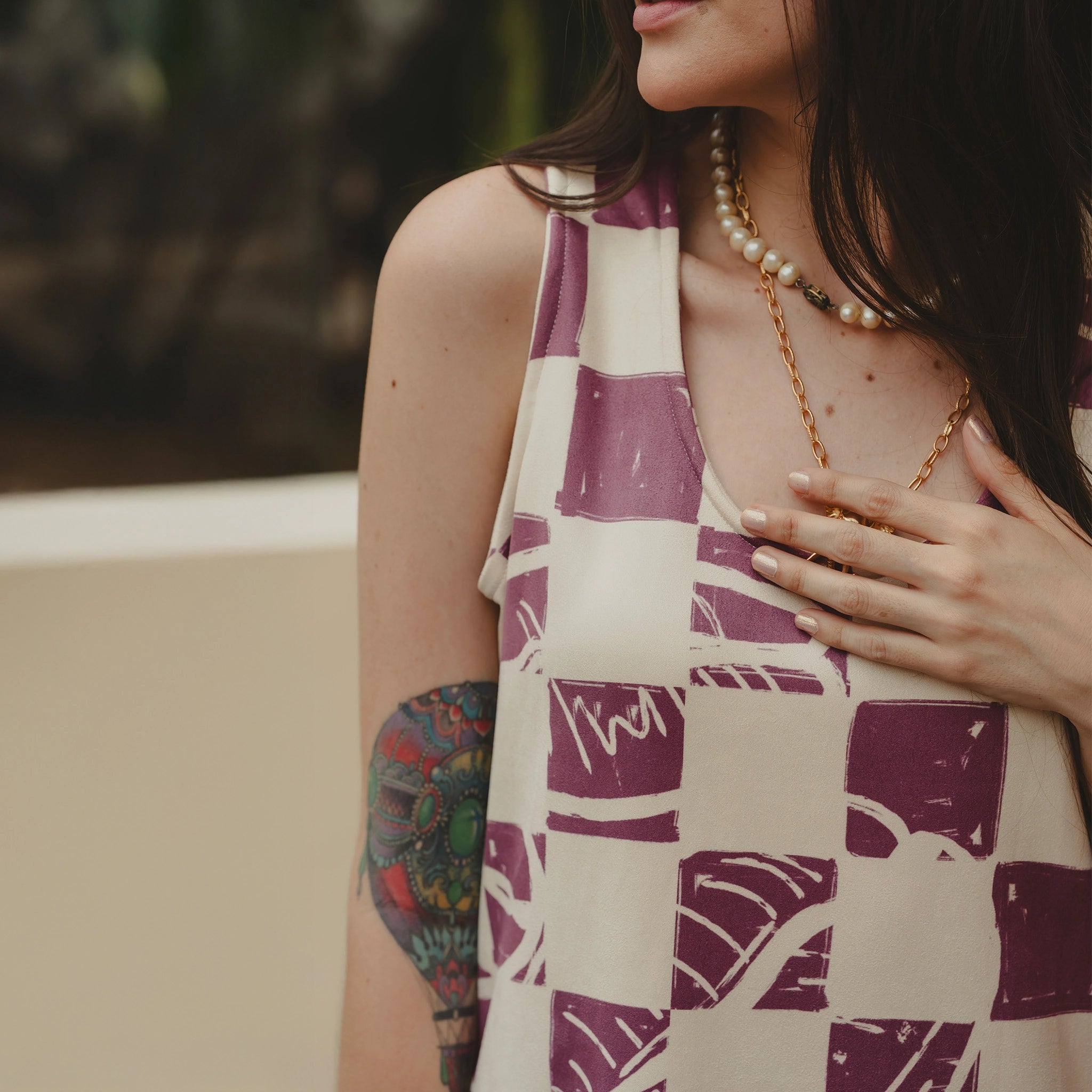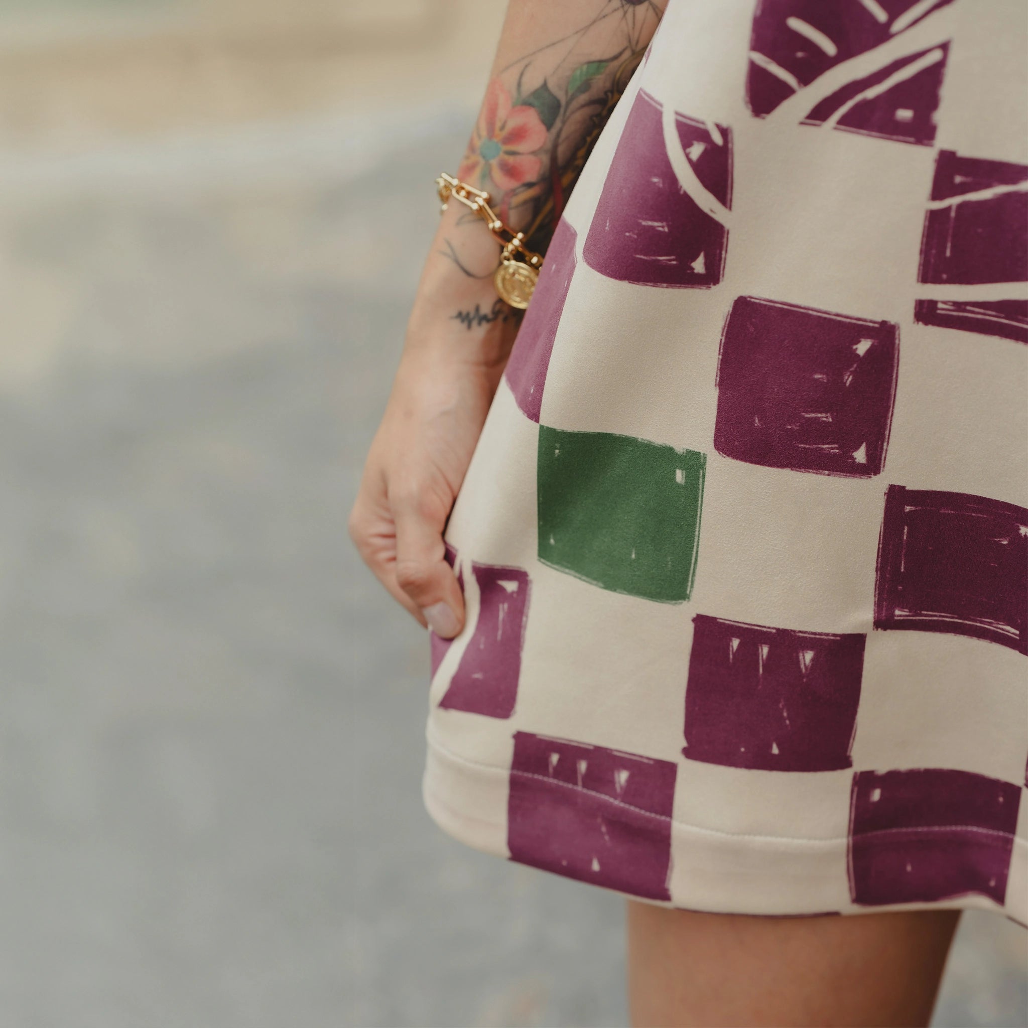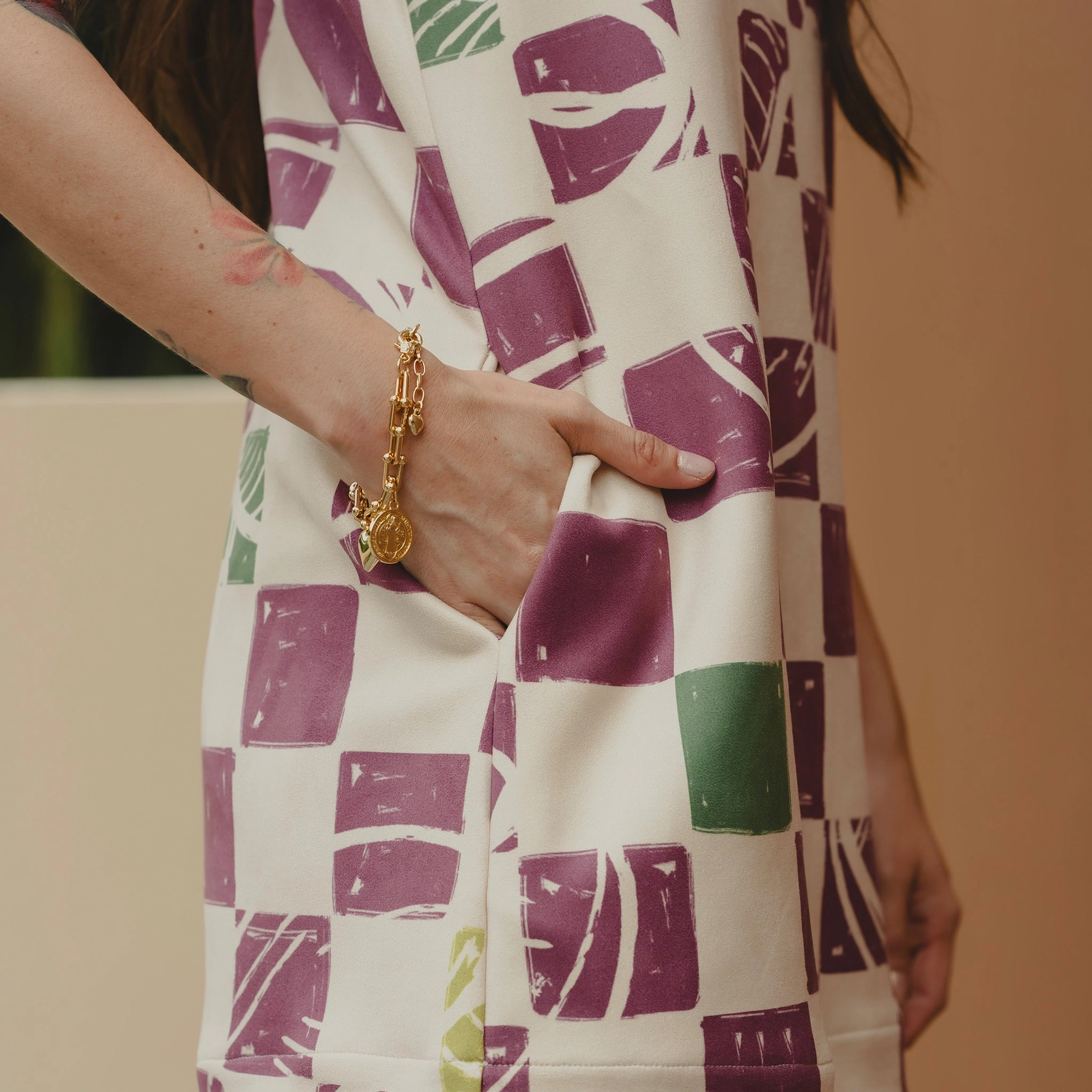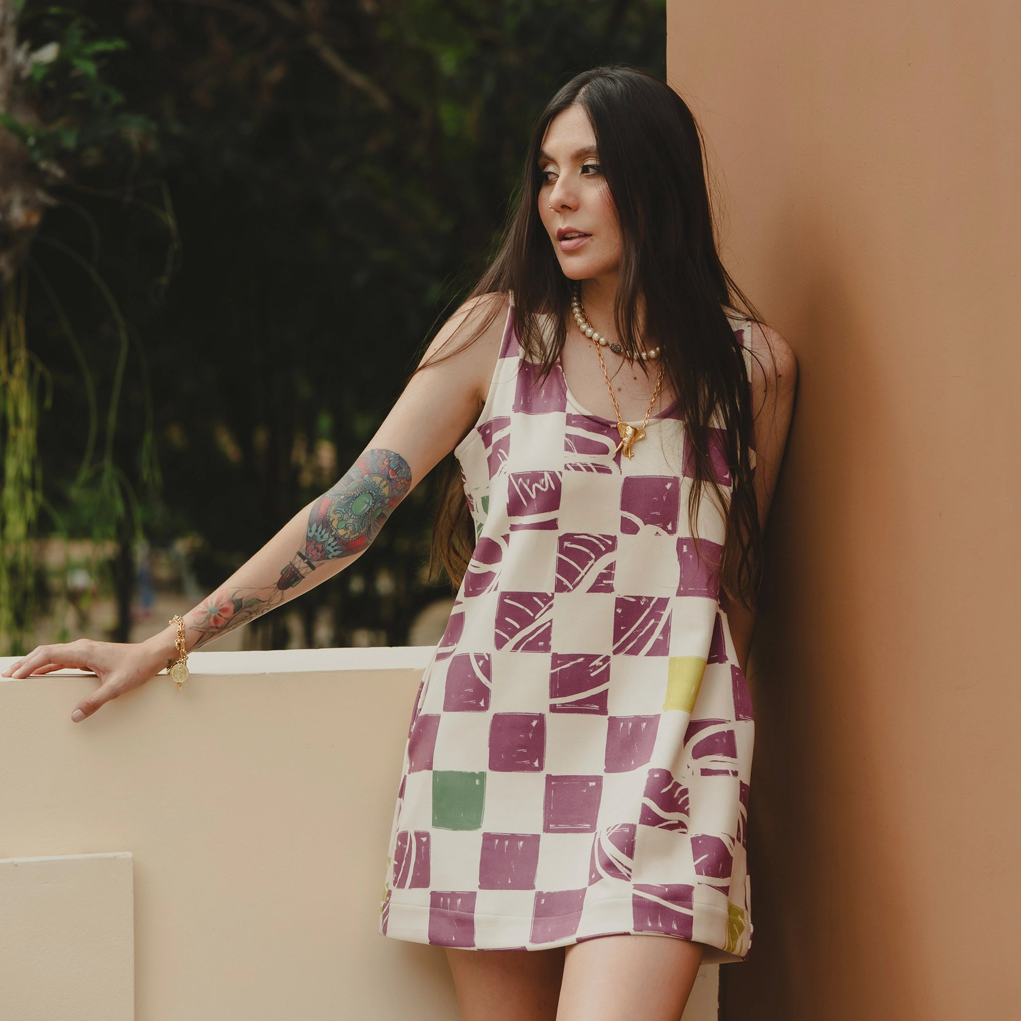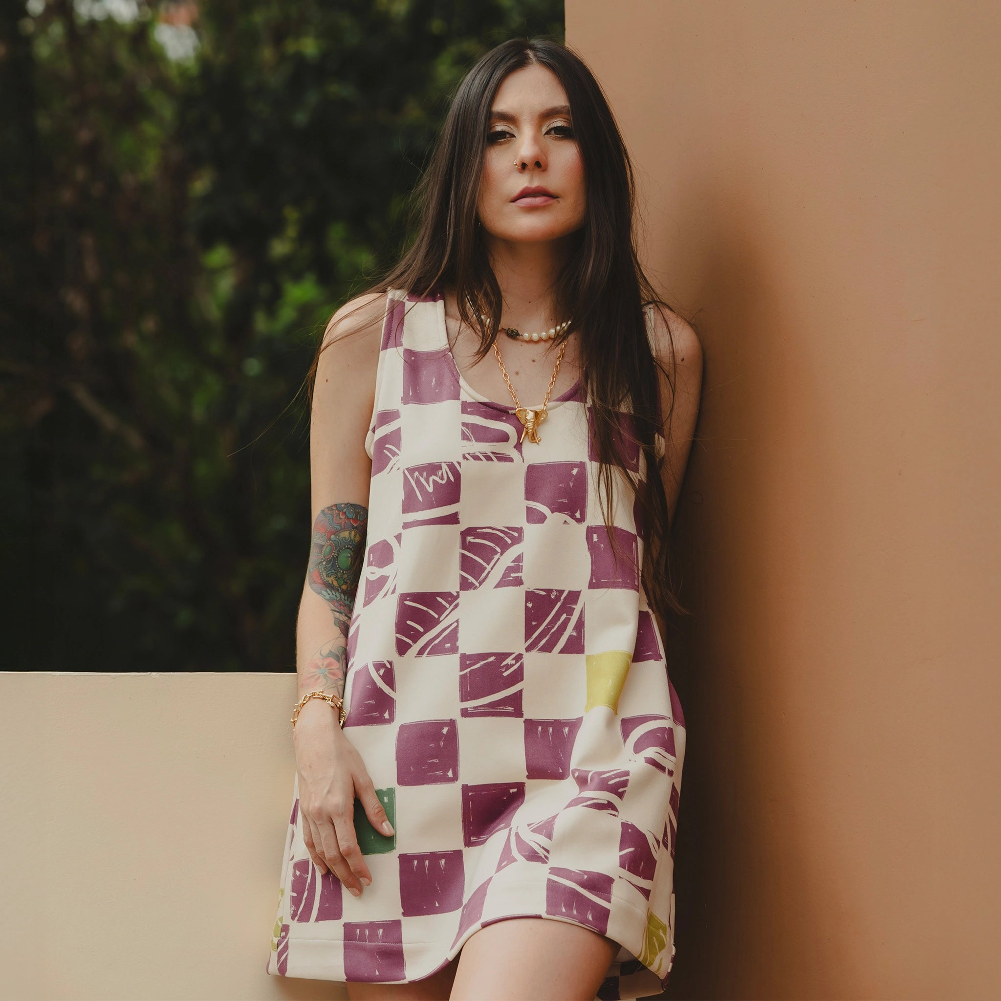 Un mini vestido con sabor a raíces profundas y color a cosecha. Este diseño celebra la esencia del café colombiano con un estampado geométrico inspirado en las texturas del grano y los paisajes que lo cobijan. Su silueta corta, sin mangas y de corte relajado es ideal para llevar con confianza y frescura.