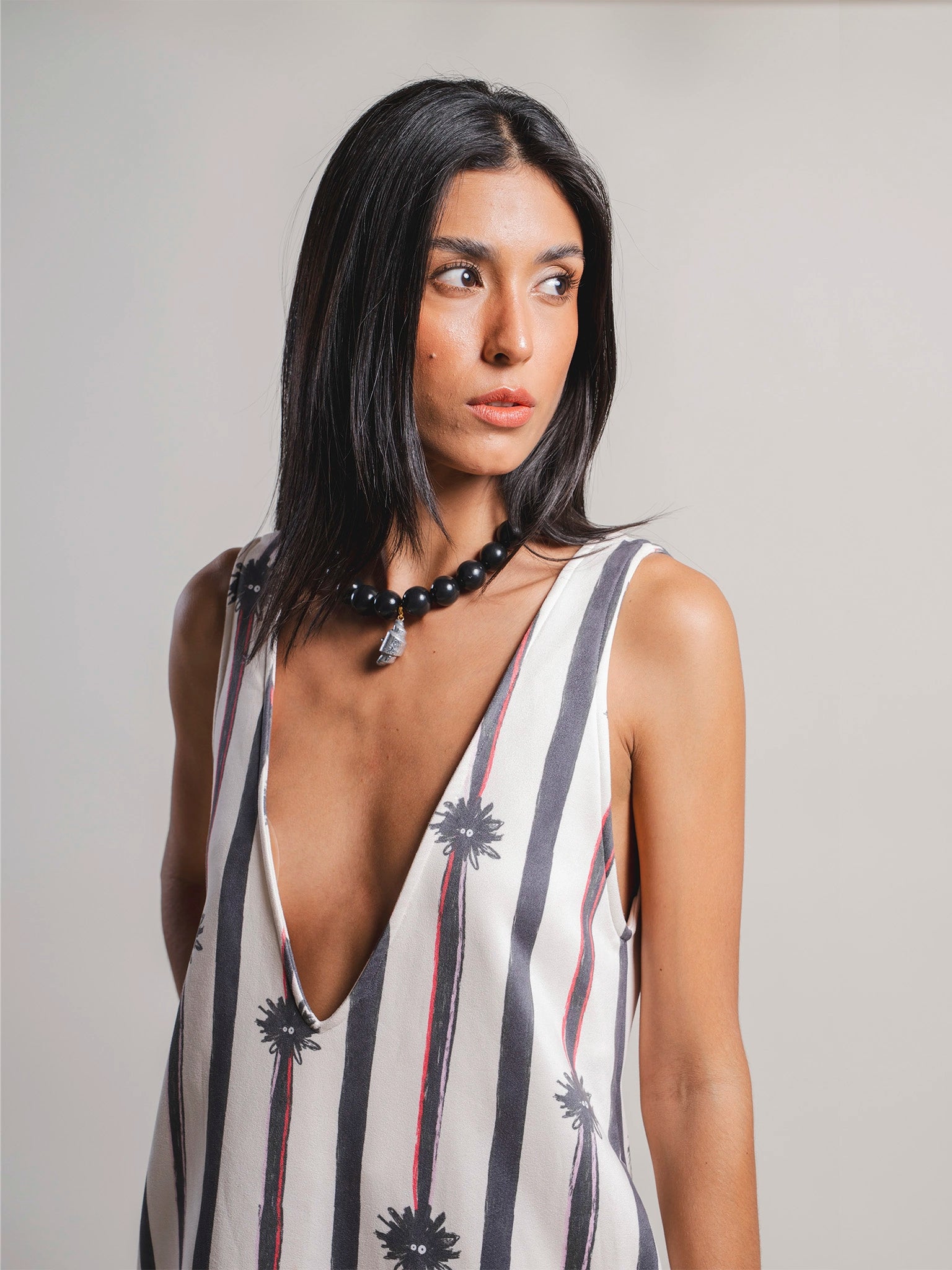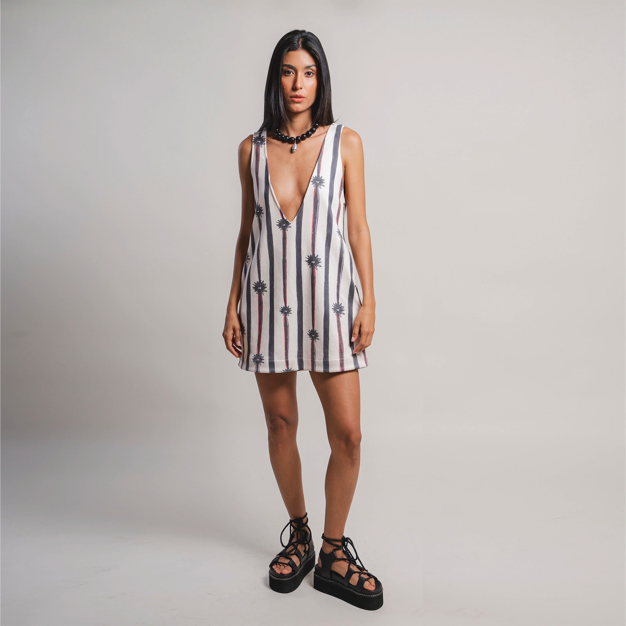 Mini vestido en gamuza ligera con escote profundo en V adelante y atrás, perfecto para llevar con actitud y frescura.