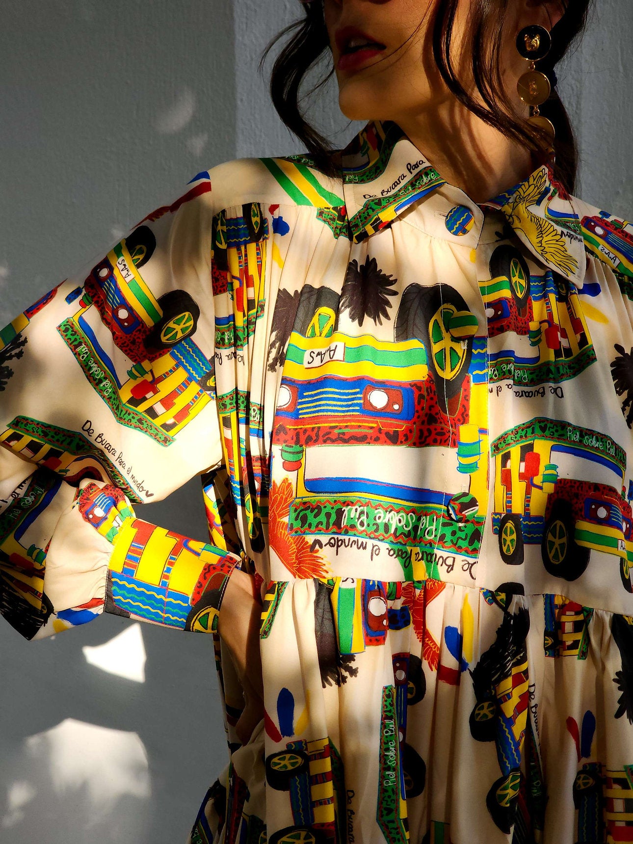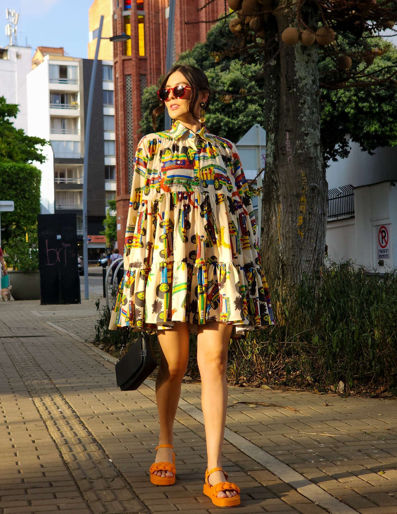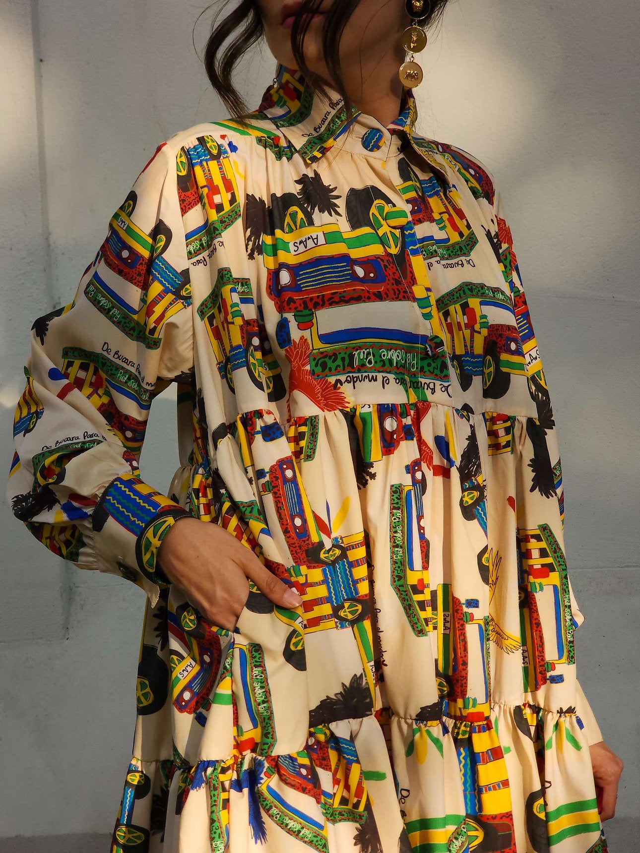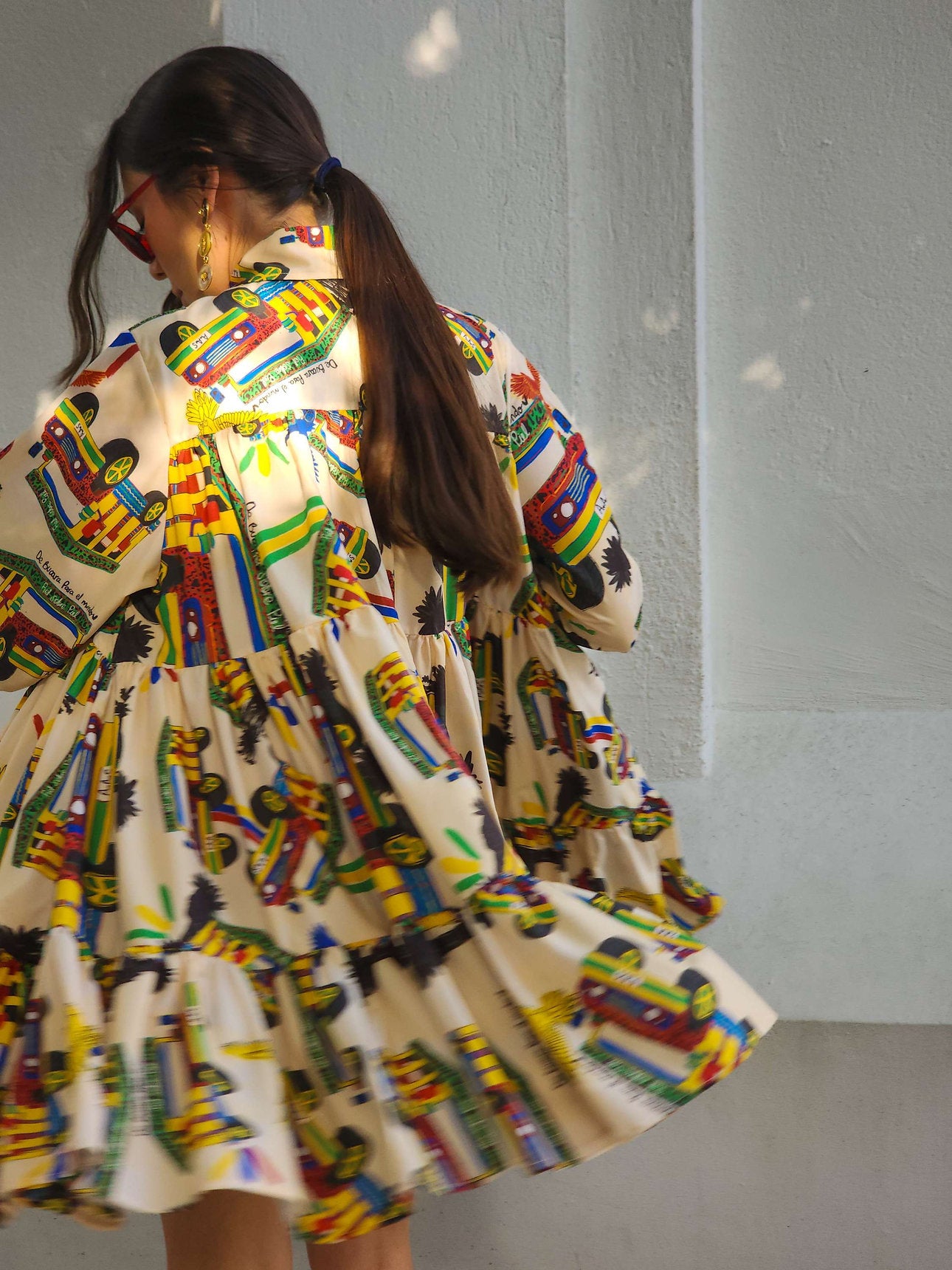 Un diseño que celebra la riqueza cultural y natural de Colombia. Este vestido oversize combina guacamayas, frailejones, chivas y texturas animal print sobre un fondo beige, evocando nuestra biodiversidad y tradiciones.